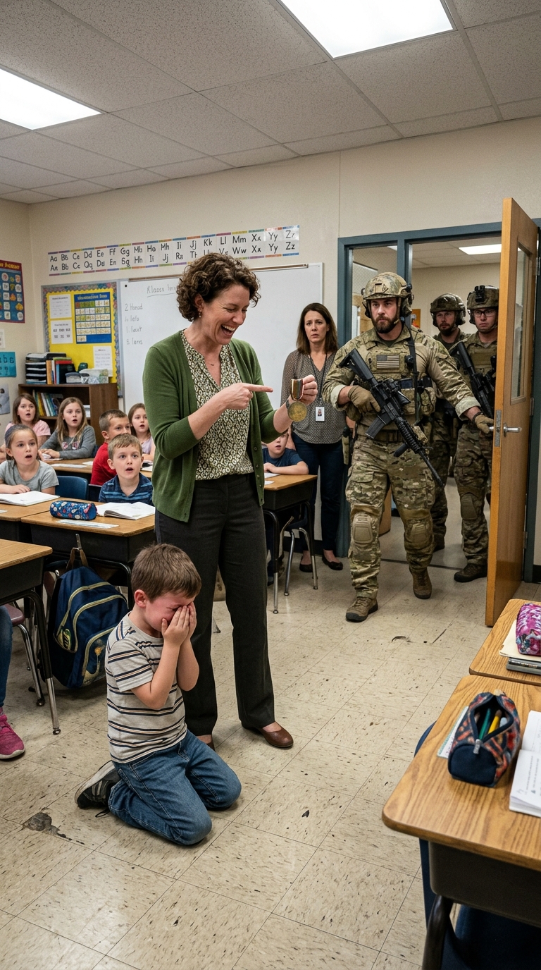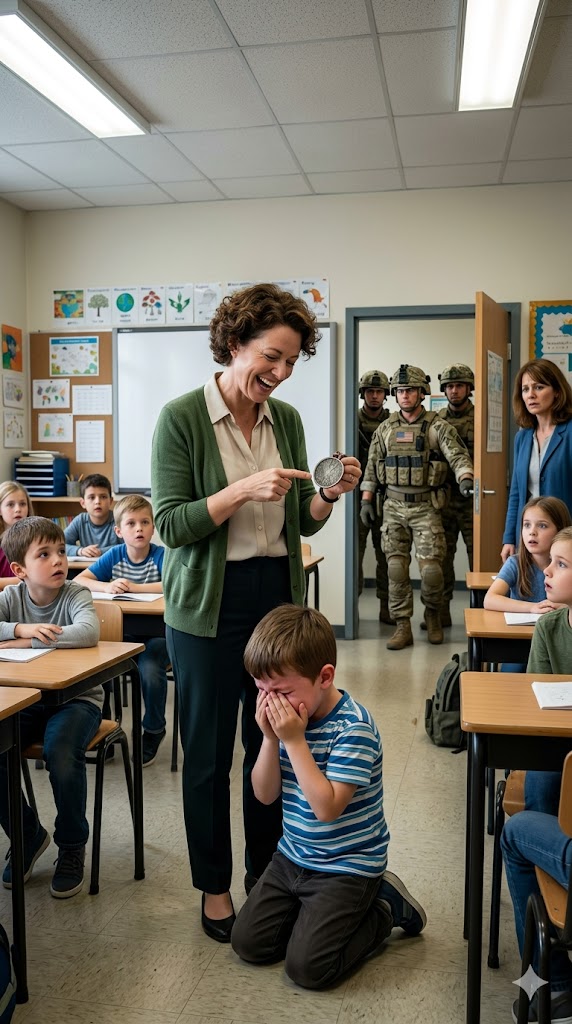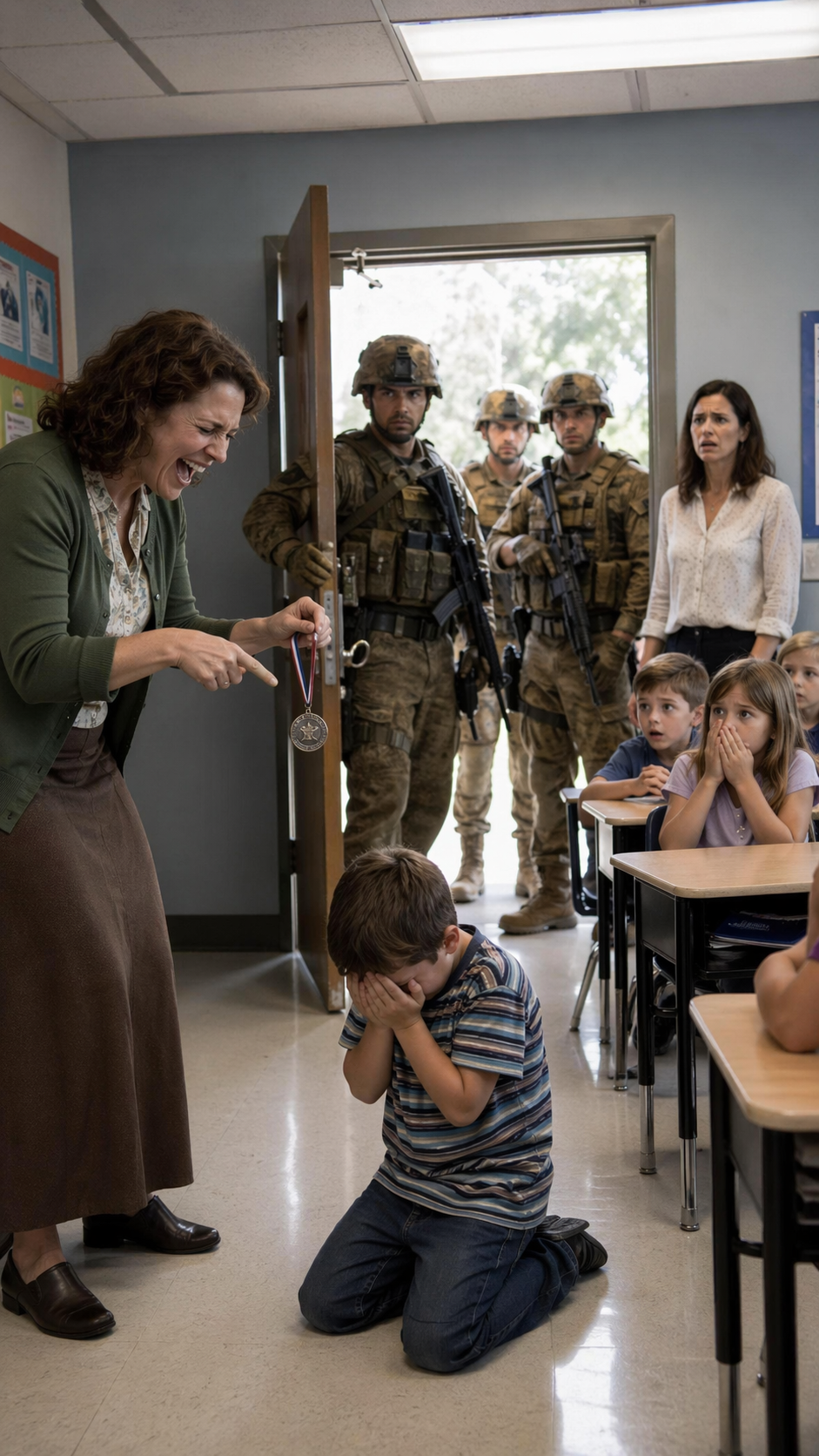 My 6-year-old son brought a scratched-up medal to Show and Tell. His teacher actually laughed in front of the whole class, rolling her eyes and saying, “It’s a cheap plastic toy, stop lying for attention.” My child broke into tears, whispering, “But my Dad said it’s the most important thing in the world.” Suddenly, three heavily armed soldiers marched into the classroom. Suddenly, the door swung open again and three men in full tactical gear entered. The expression on the teacher’s face when the commanding officer explained exactly what that “toy” really was… pure, unfiltered panic.