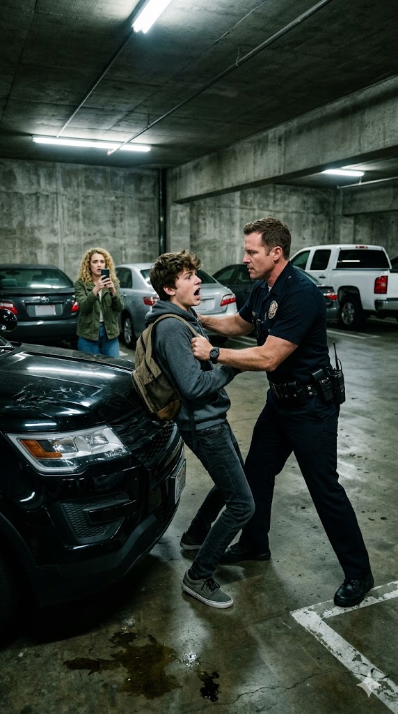 A sharp impact echoed through Terminal B’s parking garage as a teenage boy was slammed face-first onto the hood of a black SUV. His backpack burst open, sending books, clothes, and papers scattering across the wet concrete.