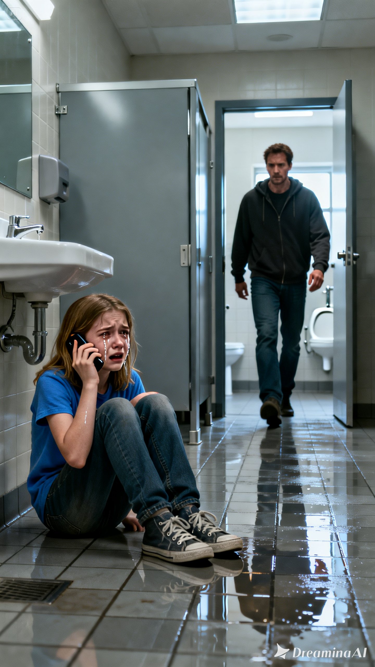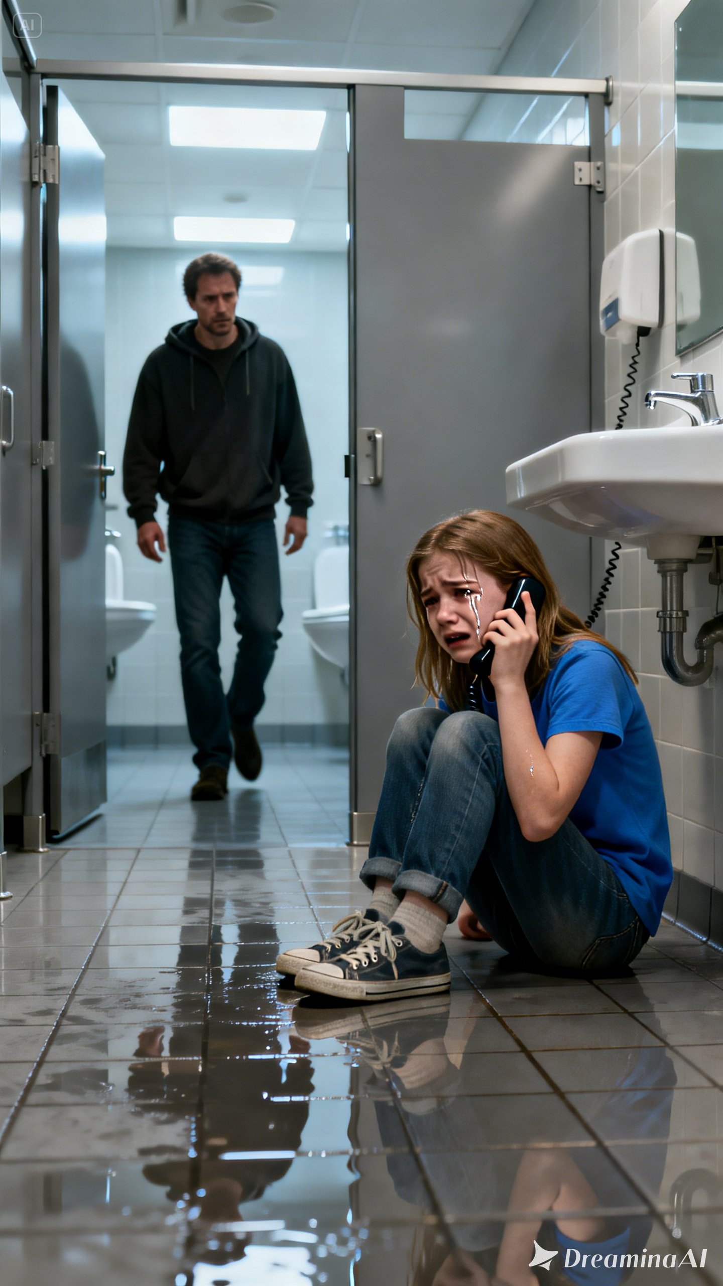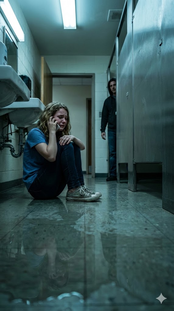 A small, shaking voice murmured, “I’m hiding in the school bathroom… someone is following me.”