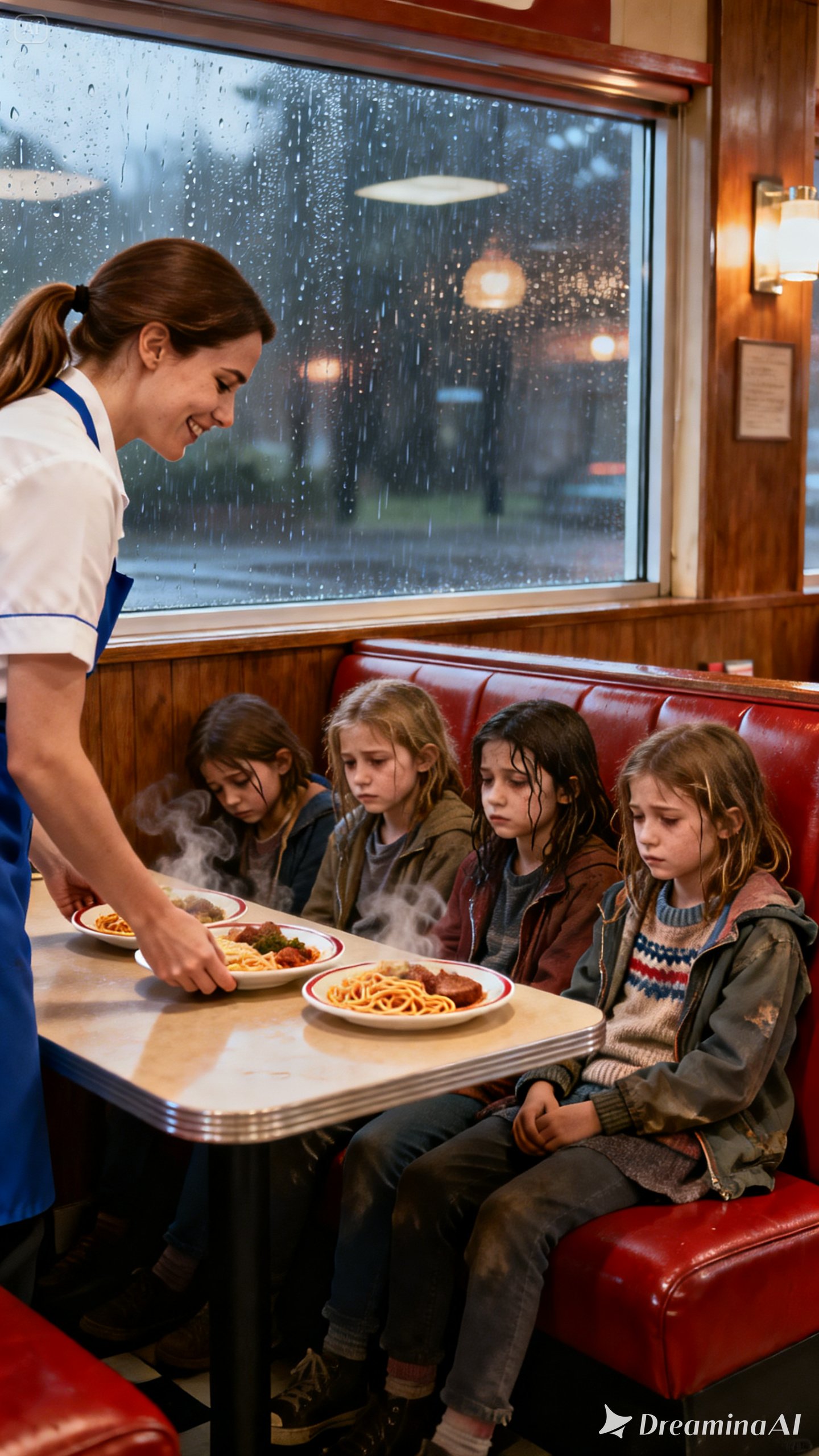 Slowly, they followed her inside. She led them to a booth by the window and rushed back to the kitchen. A few moments later, she returned with four plates of hot, steaming food and set them down in front of the girls.
