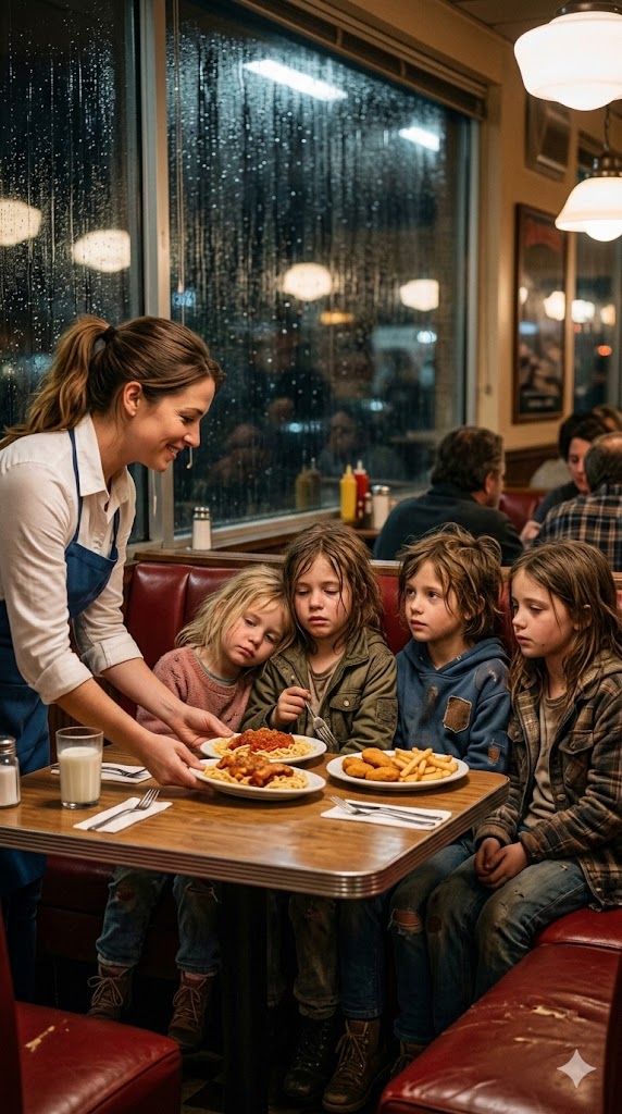 On a rainy evening in a small, quiet town, Emily Parker, a young waitress, noticed four little girls gathered together outside the window of her diner. Their clothes were worn and torn, their faces pale, and their eyes carried the quiet burden of hunger and loneliness. Emily felt a sharp ache in her heart. These children had no one—no parents, no home, no warm place to return to.