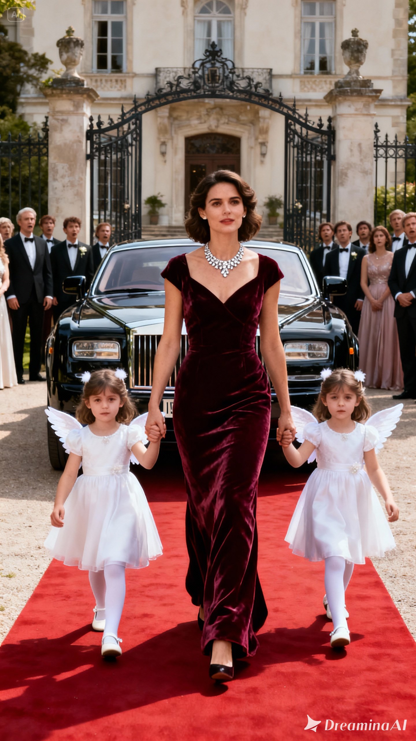 She wore a red velvet gown that hugged her figure perfectly. A diamond necklace shimmered at her throat. Her face was beautiful, poised, and radiated confidence.