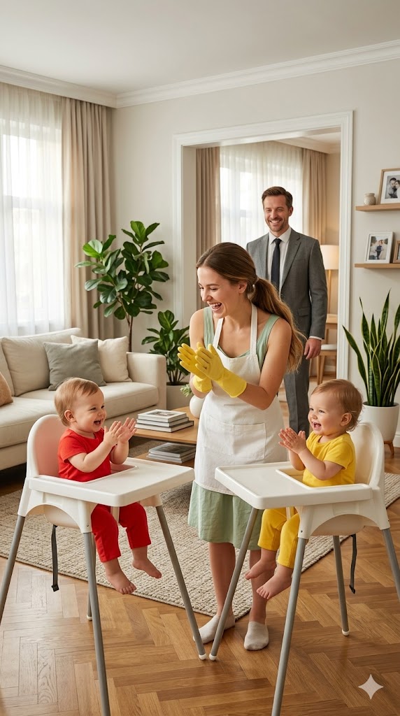 At the center of the room stood Maya Carter, the new nanny, dressed in her simple uniform—but wearing oversized yellow kitchen gloves. Large headphones covered her ears as she moved in exaggerated, playful motions, turning the gloves into characters, making them “argue” through silly gestures and dramatic expressions.