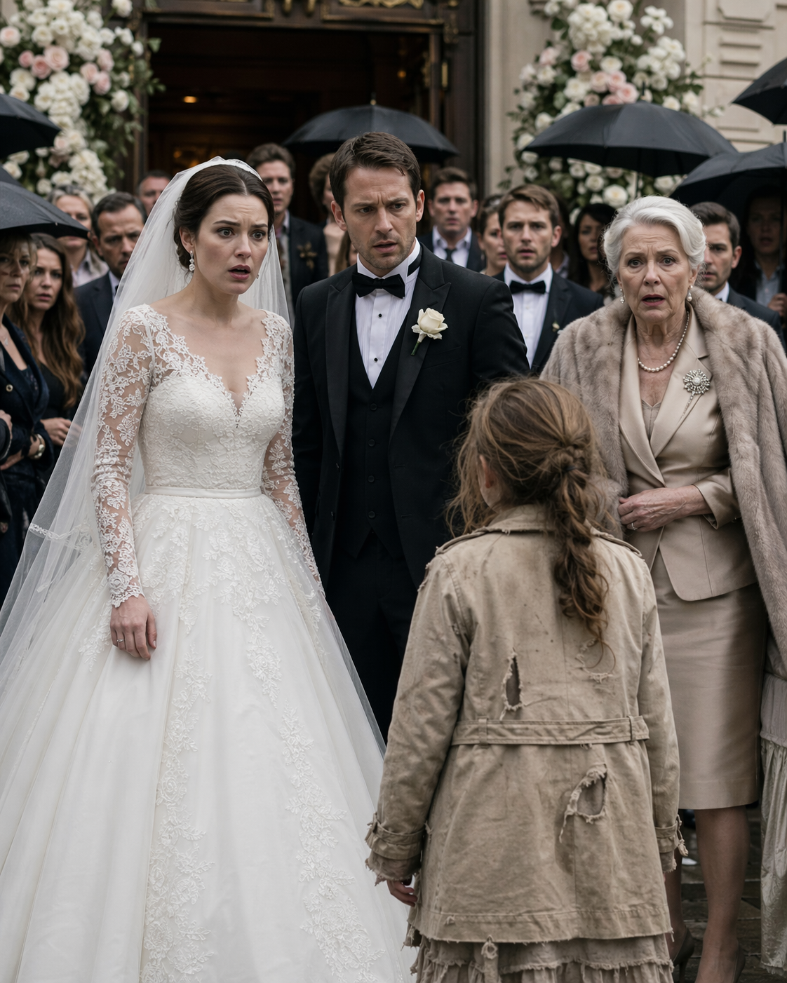 The wedding came to a halt right there on the church steps. The music faded into silence. The guests froze. The bride looked between the little girl and her future mother-in-law, and suddenly understood that the fear on the older woman’s face wasn’t confusion — it was guilt.