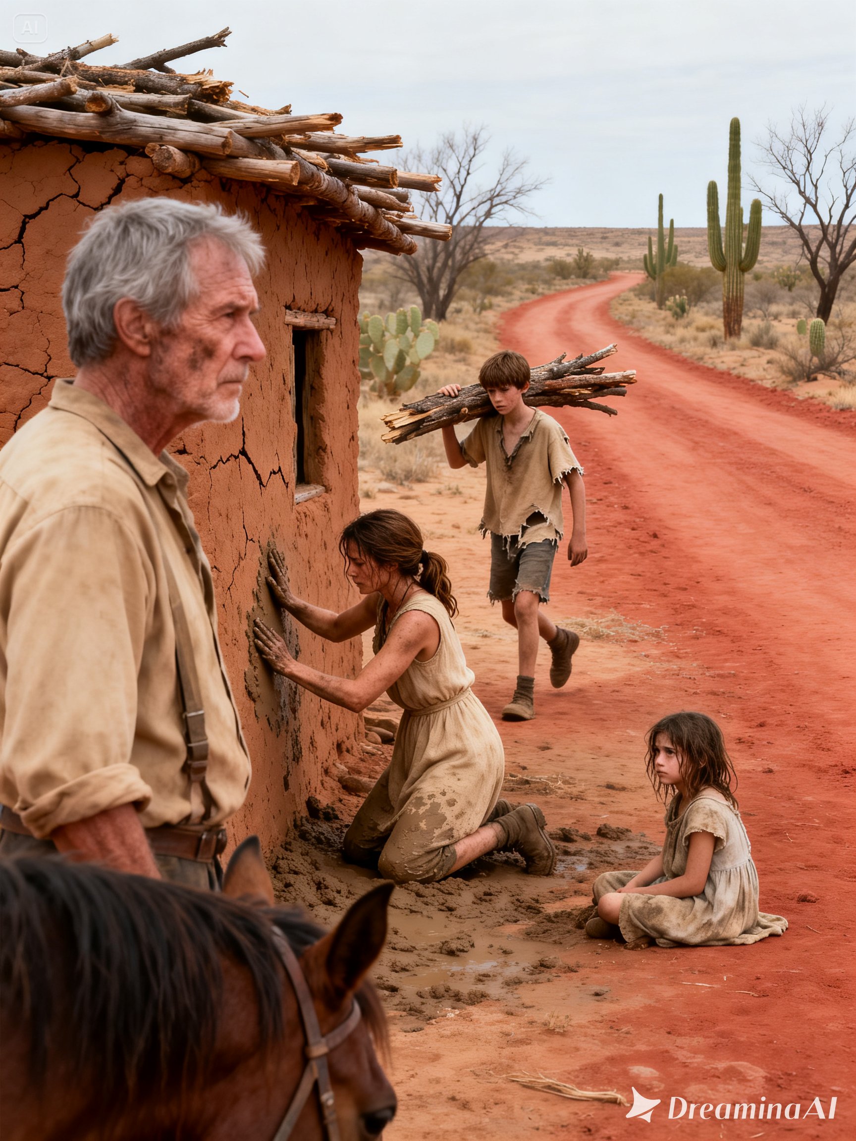 A woman on her knees, pressing wet mud against a frame of crooked branches. A young boy dragging an impossibly heavy pole, his arms straining. And a little girl sitting on the burning ground, her hands covered in mud up to the elbows, staring ahead with that hollow look children get when their bodies give up before their spirit can name it.