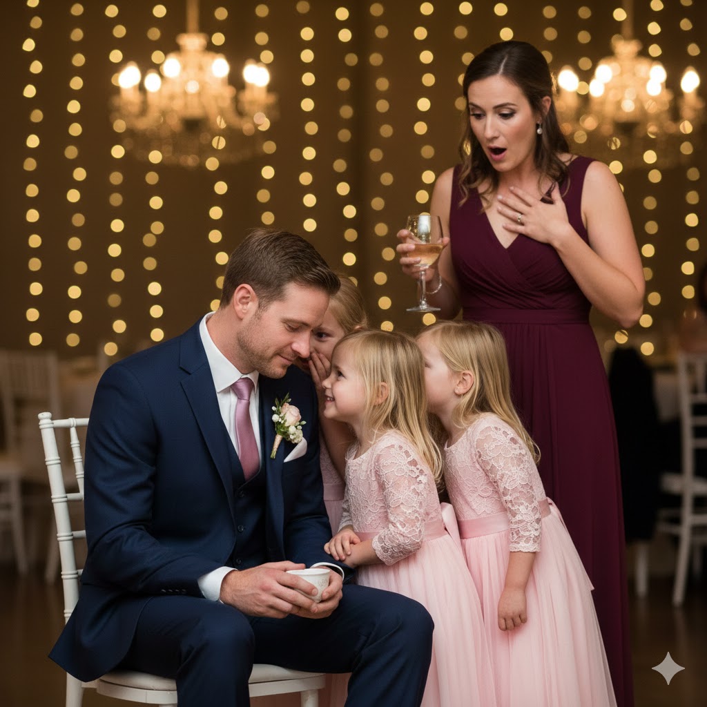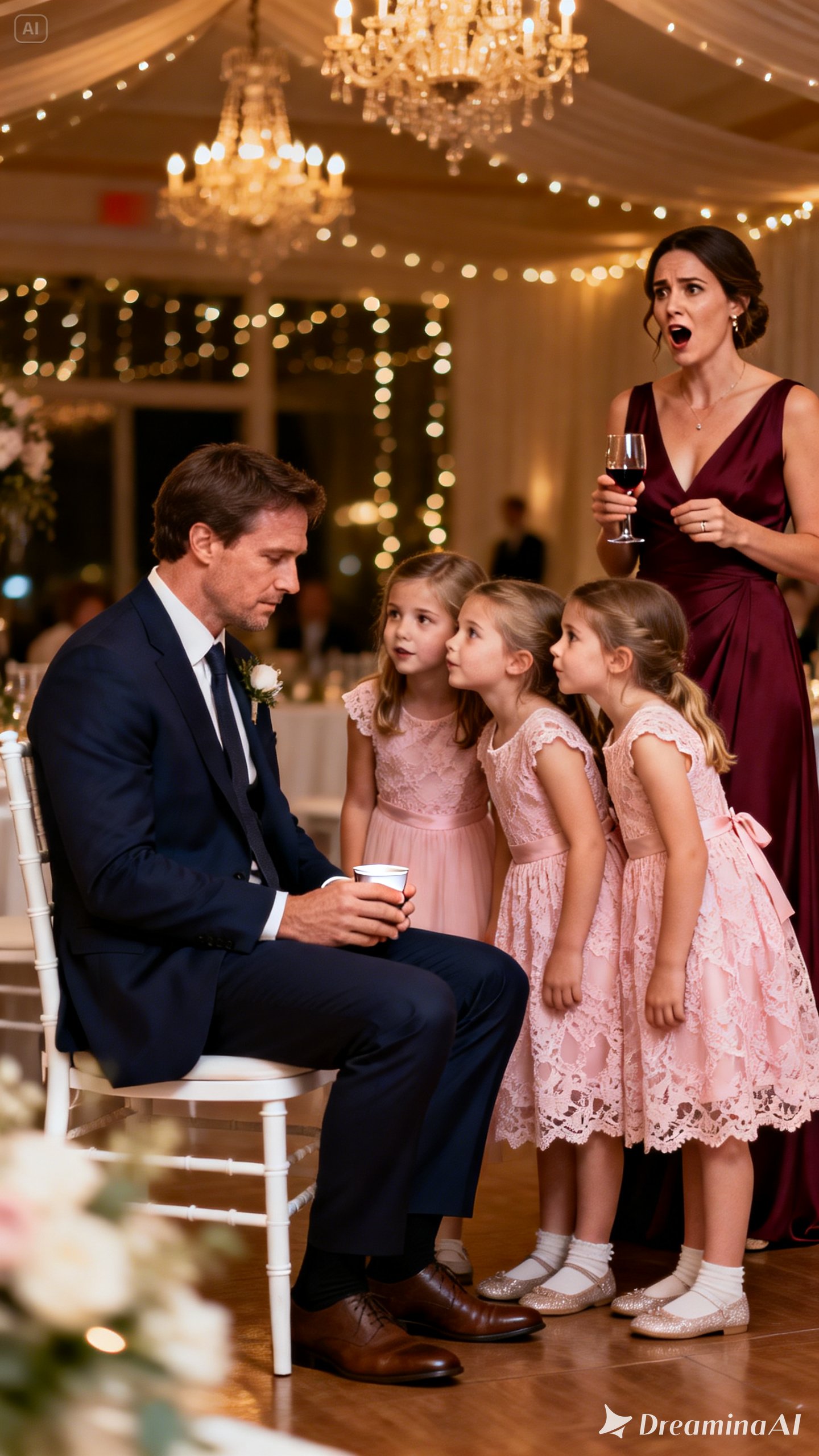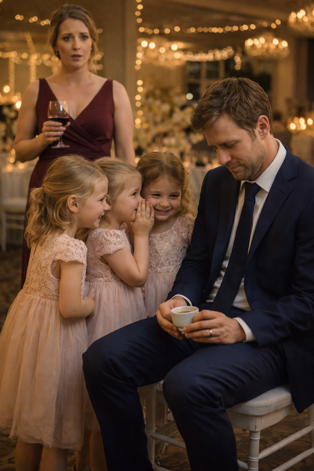 Instead, three identical little girls stood beside his table, so perfectly aligned that for a moment he wondered if exhaustion was playing tricks on him. They looked to be about six years old, each with pale curls pulled back by matching blush-pink ribbons, neatly pressed dresses, and expressions unusually serious for children their age.