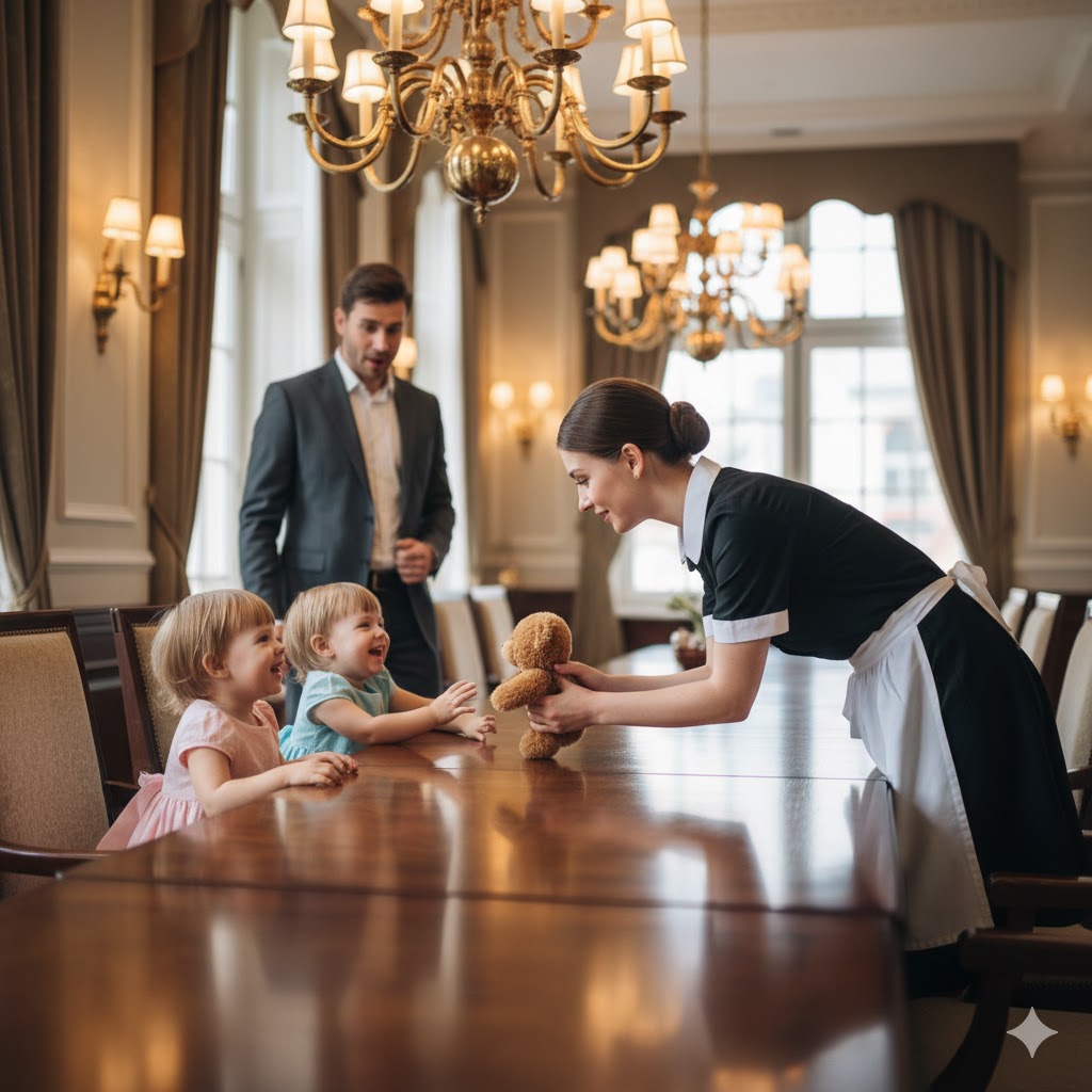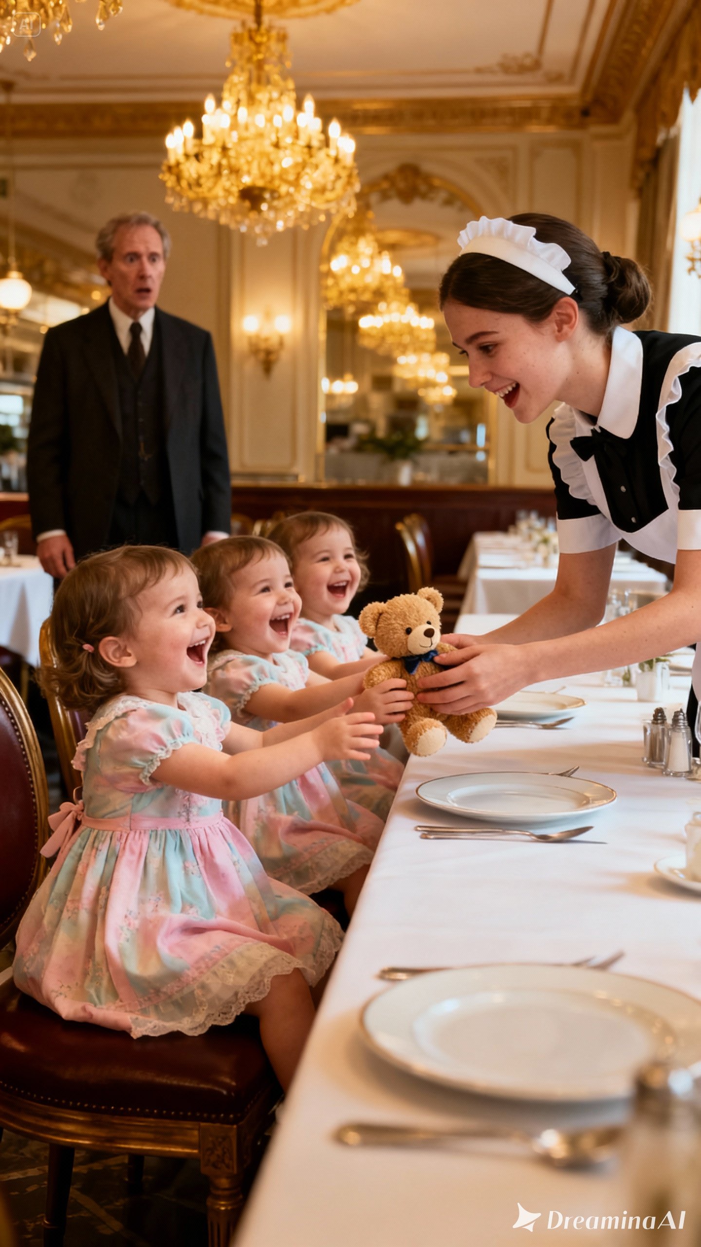 Sofia, Lily, and Maya—identical five-year-old triplets—walked in a perfect line. The same dark bangs. The same wide, alert eyes. The kitchen hissed with hot oil. The dining room smelled of burnt coffee and warm steel.