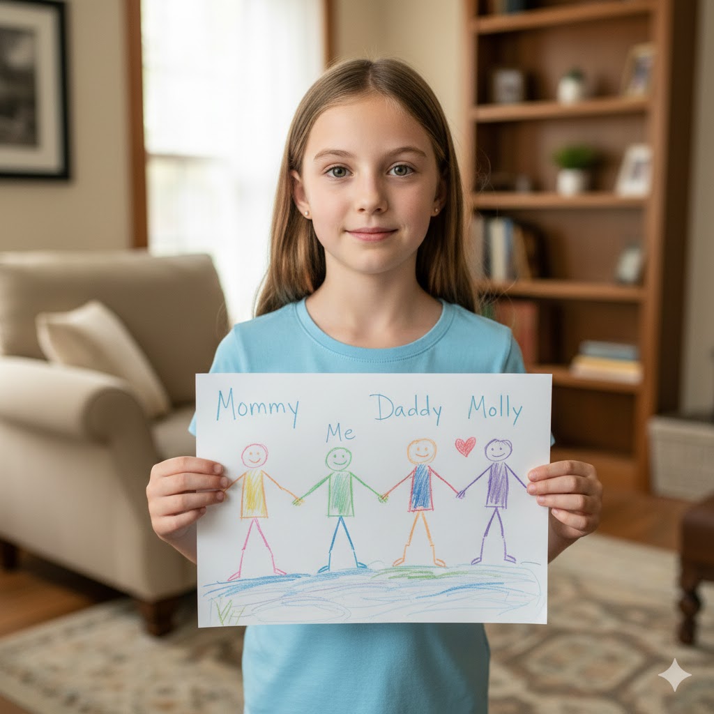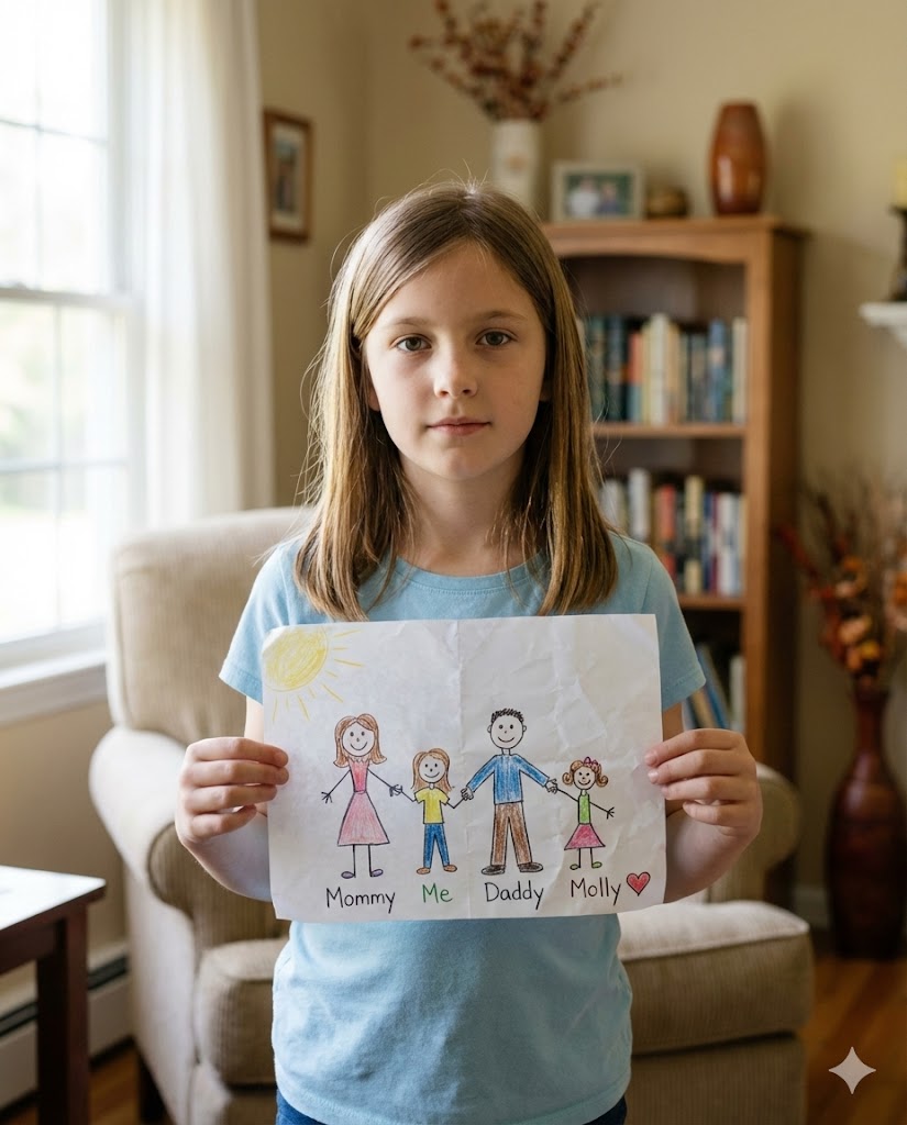 Then Ruby’s preschool teacher gently passed me a picture: our family under a bright star—me, my husband Dan, Ruby—and one more woman, smiling, labeled “Molly.” The teacher said Ruby spoke about Molly like she belonged in our lives. I smiled, thanked her, folded the paper, and walked away calm on the outside while everything inside me unraveled.
