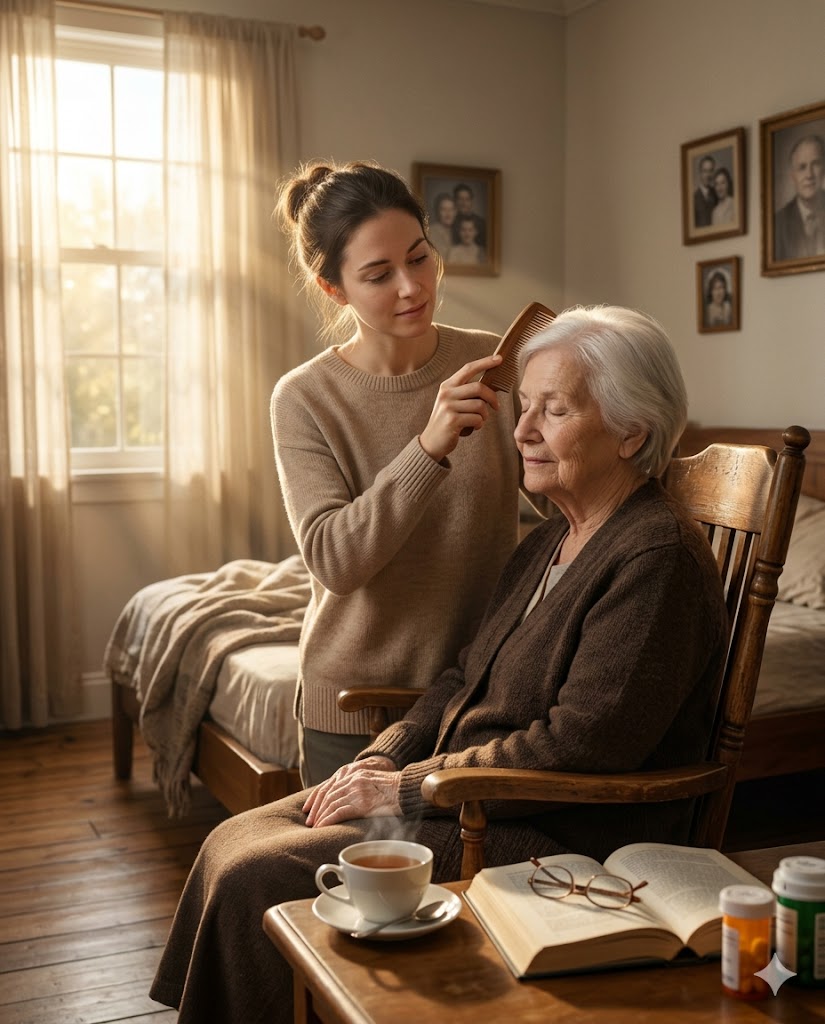 Despite the gray autumn sky outside, the room was bright. A large wooden bed stood near the window, surrounded by books and framed photographs. In those photos, she had been a strikingly beautiful woman—one of those faces that didn’t fade with age, only deepened.