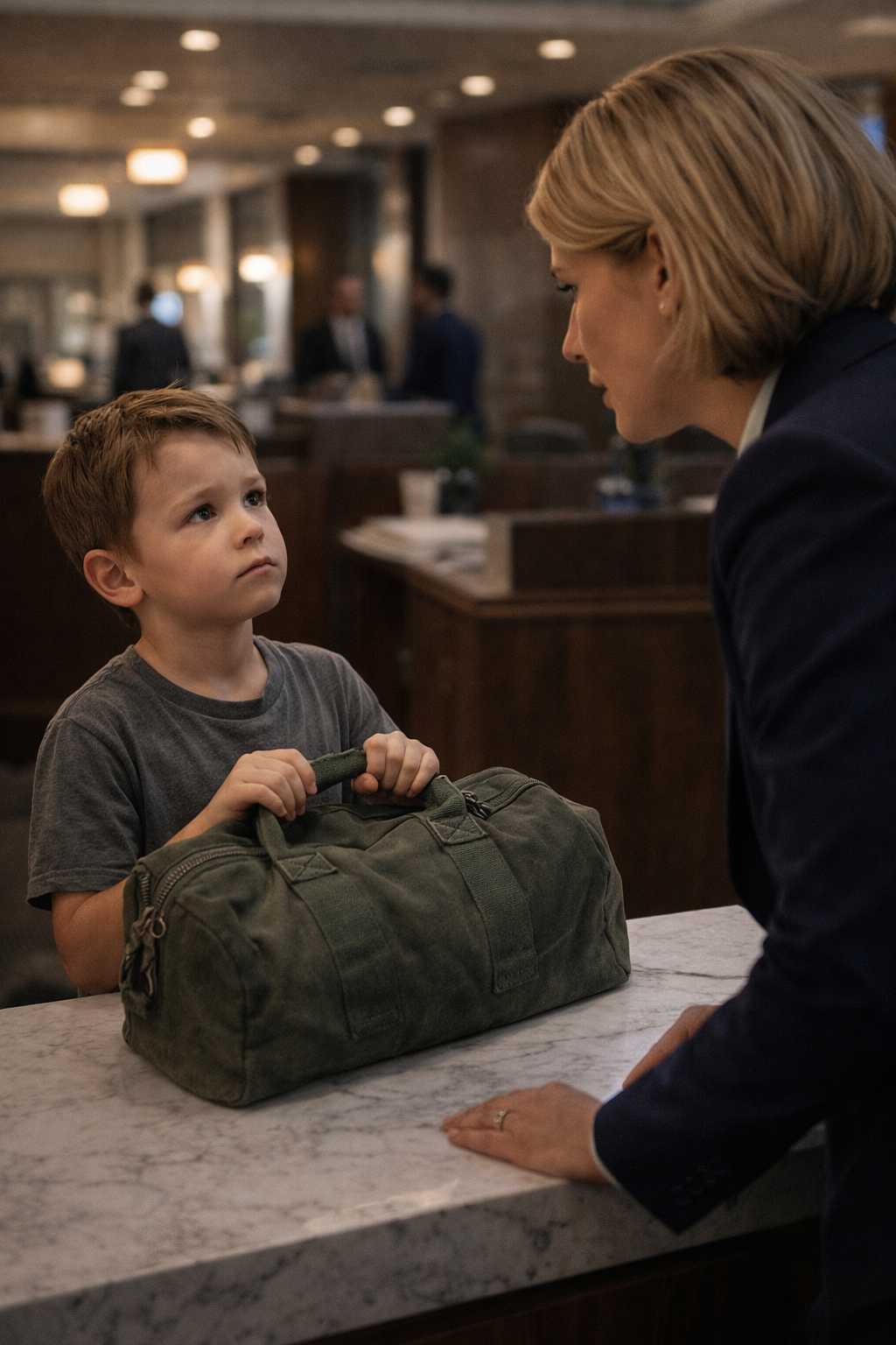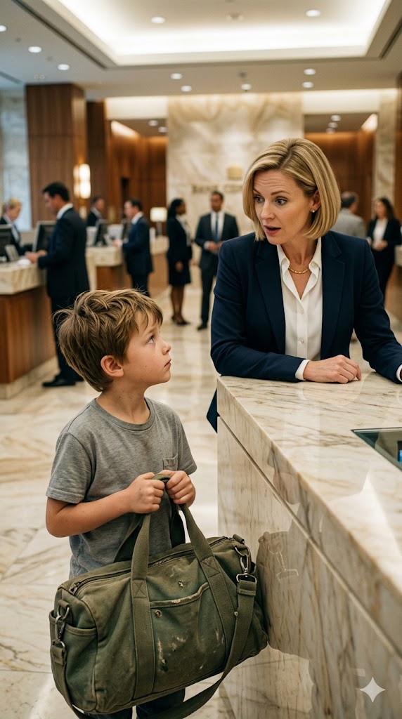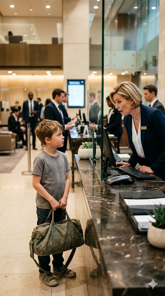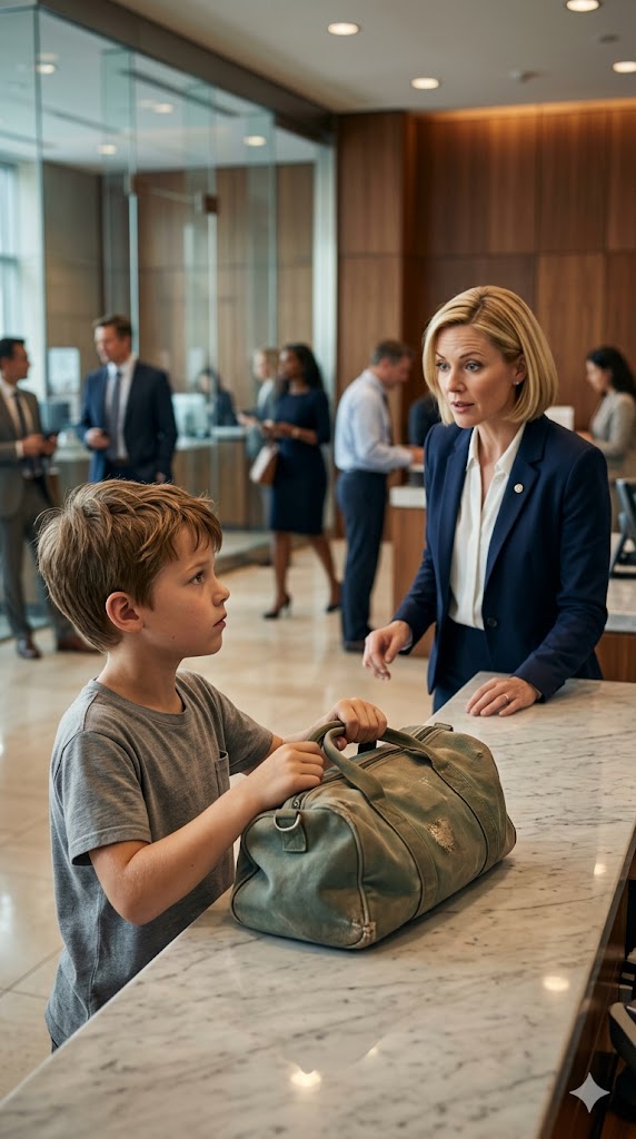 He squared his shoulders and crossed the lobby with quiet determination, enough to make her set the folder in her hands aside. He walked straight toward the main counter, as if he had practiced every step. People moved out of his way without being asked—some out of curiosity, others out of discomfort.