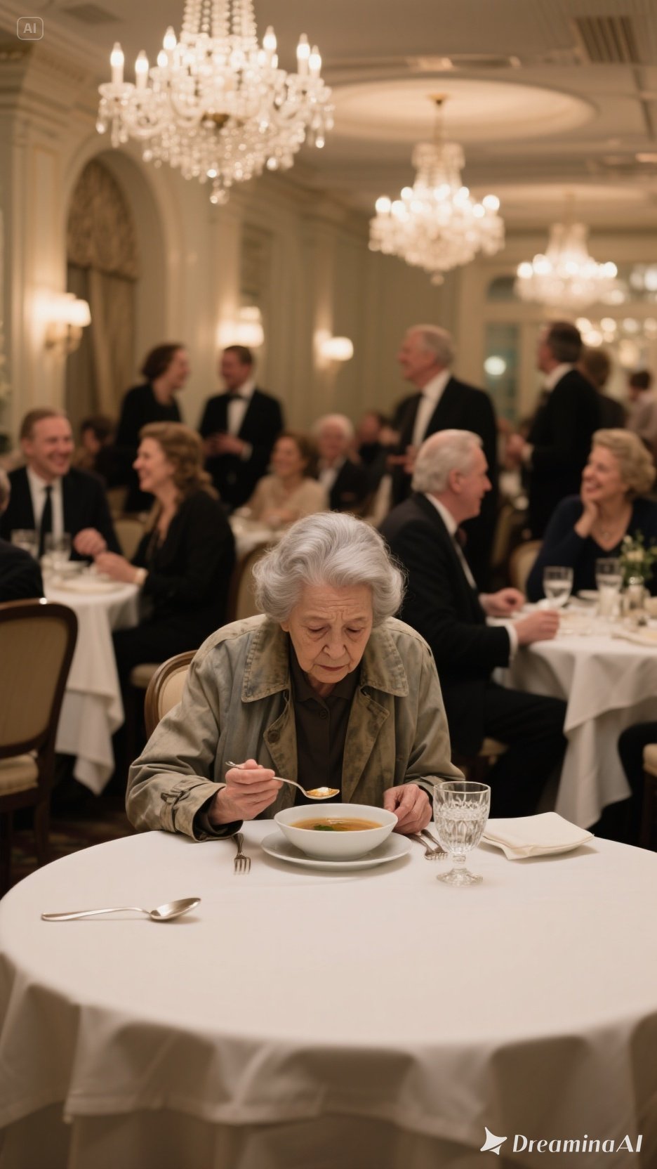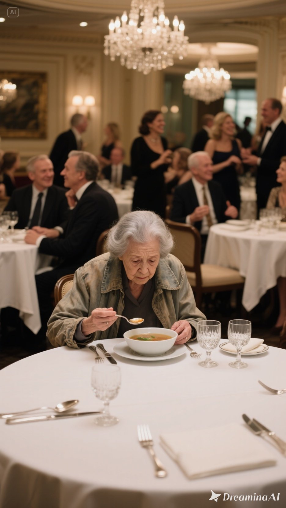 From the next table came a fizz of laughter. “She’s here for hot water,” someone murmured. “In that coat.” A guest snapped a photo as if compassion were a spectacle. The hostess ignored it; a busser looked down. Only Luis kept his eyes kind.