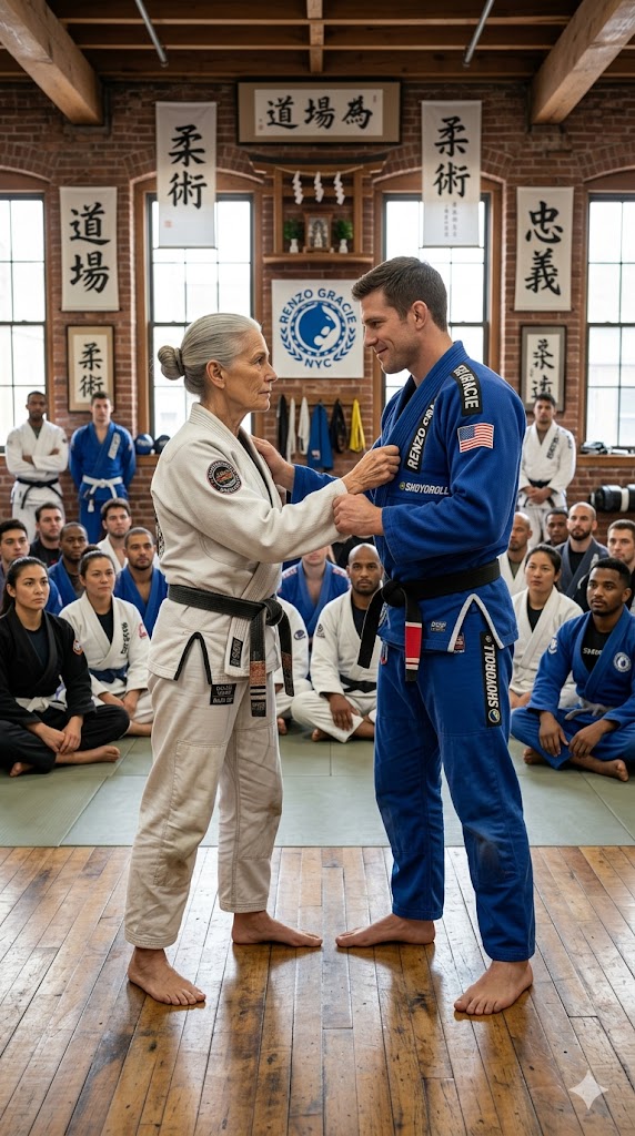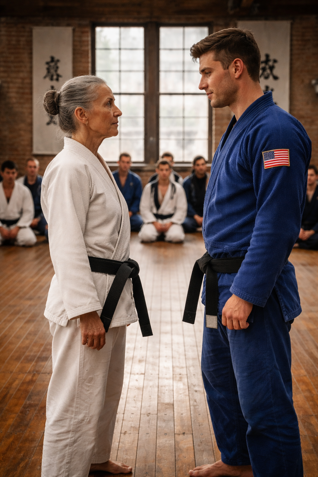 An elderly woman with silver hair tied neatly in a bun entered the jiu-jitsu academy, her kimono crisply pressed.