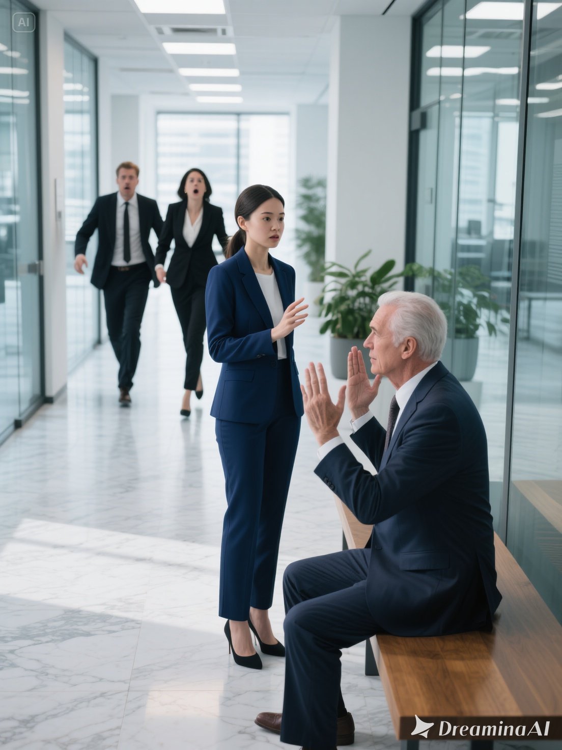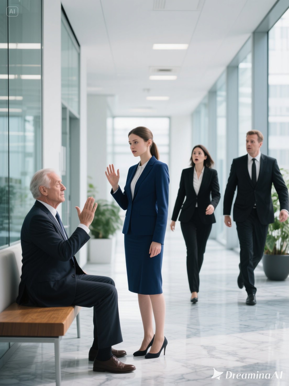 An elderly man in a navy suit stood at the front desk, trying to communicate with the receptionist, Jessica. His hands moved quickly, his mouth forming silent words. Jessica sighed, exasperated.