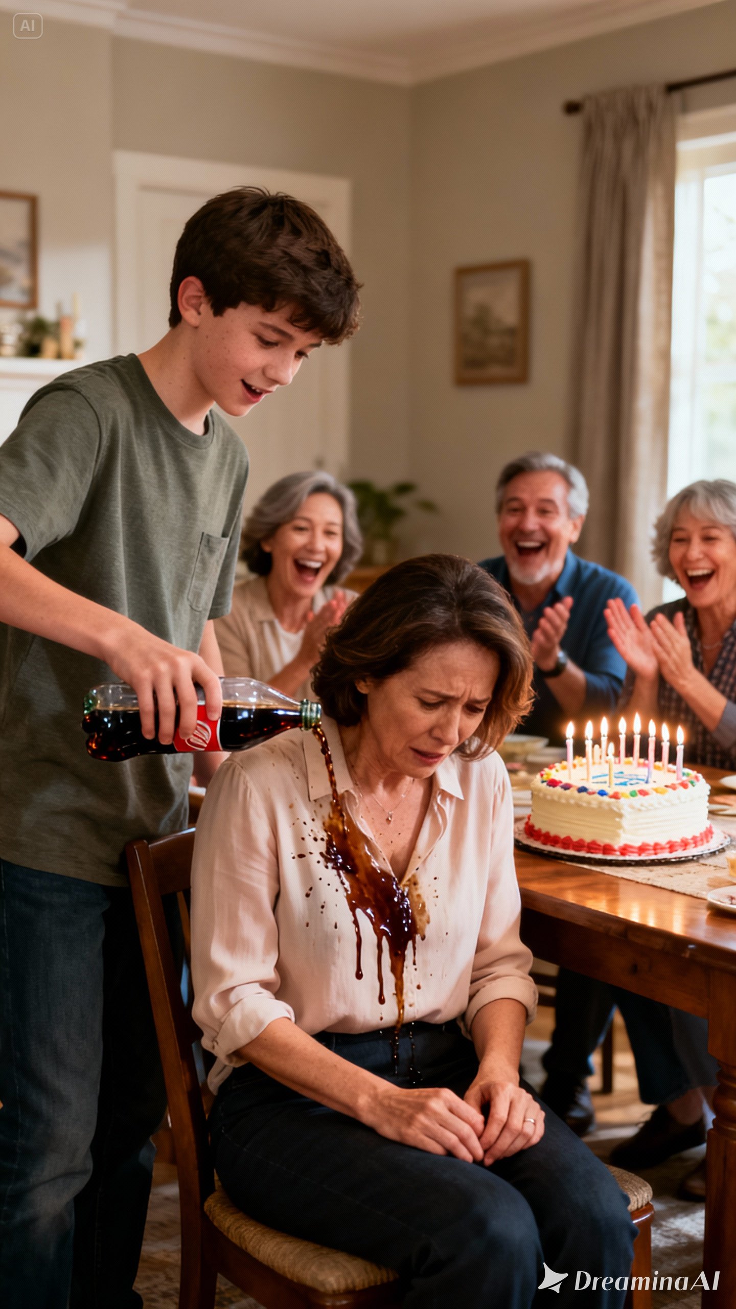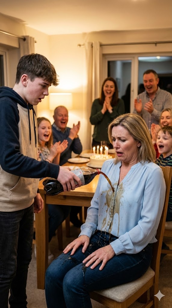 Everyone was seated, chatting loudly, when my nephew Ilya approached me with a bottle of cola in his hand. He moved slowly, deliberately, like he already knew all eyes would soon be on him. He stopped beside my chair, looked me straight in the face, and suddenly tipped the bottle over, drenching my lap in sticky, dark liquid.