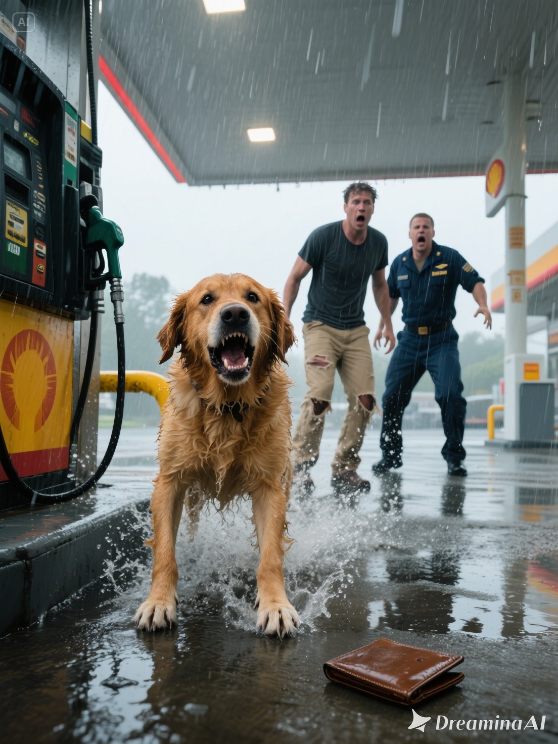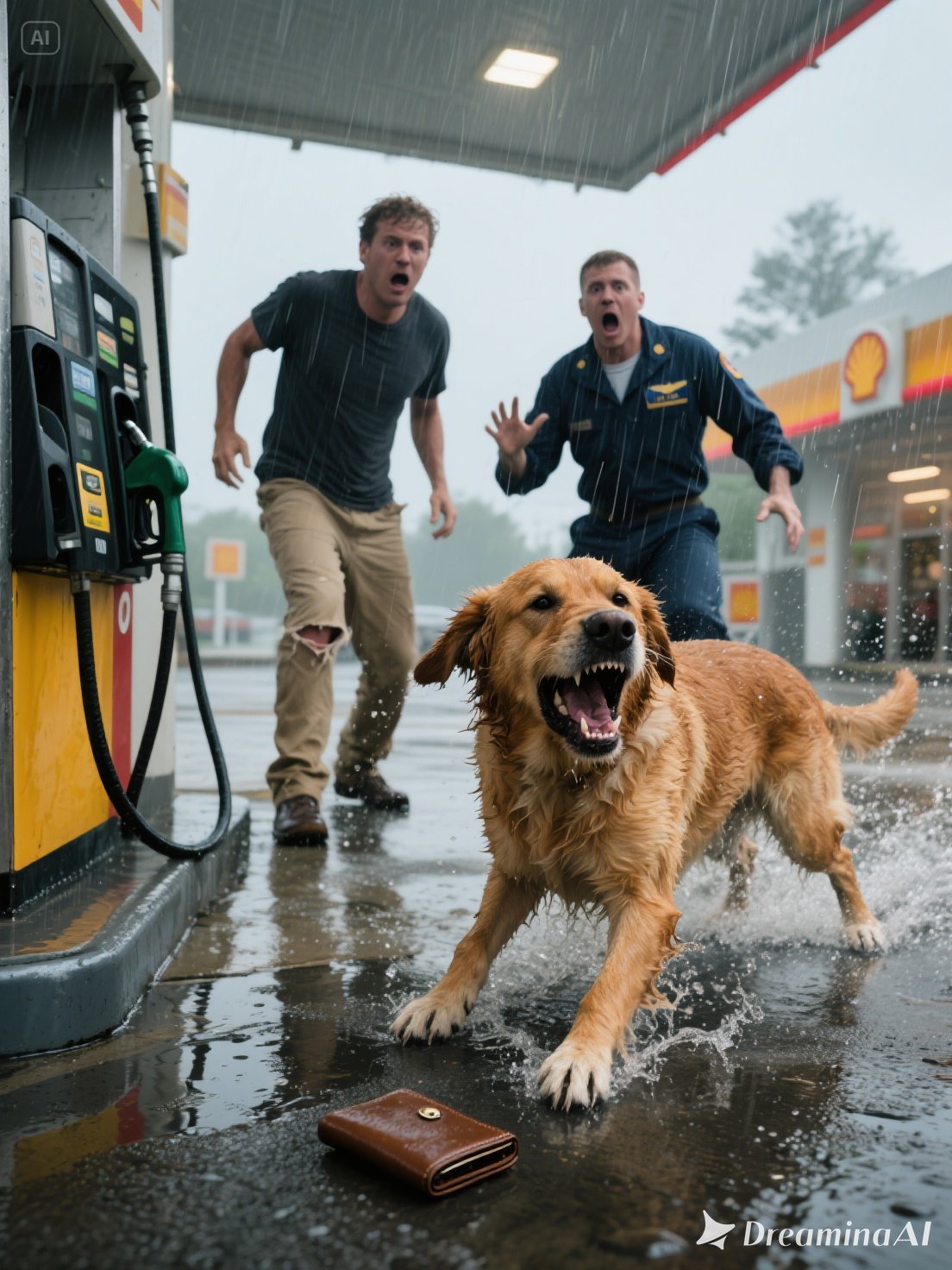 A reddish-brown dog stood beneath Pump #3, soaked from the rain, eyes blazing with intensity. It barked again — sharp, insistent, almost pleading.