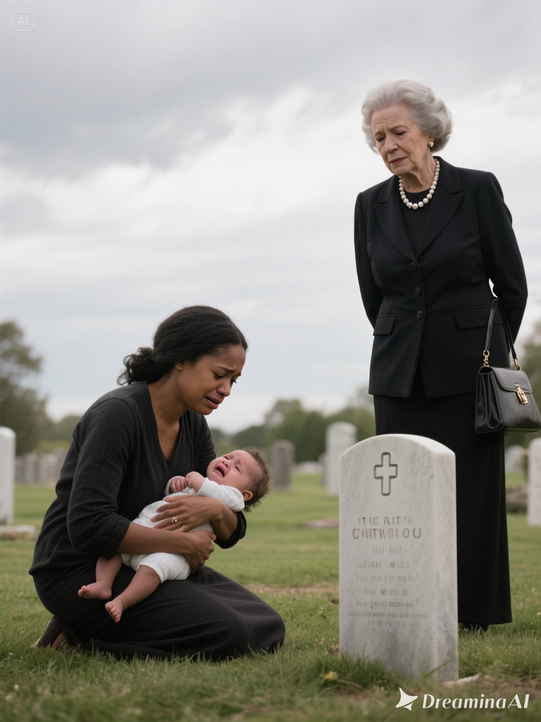 Kneeling at Jonathan’s grave was a young Black woman in a worn waitress uniform. Her apron was wrinkled, shoulders trembling. In her arms was a swaddled baby, likely only months old.