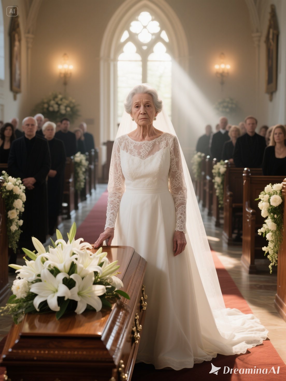 An older woman, perhaps seventy or more, walked slowly down the aisle in a white wedding gown.