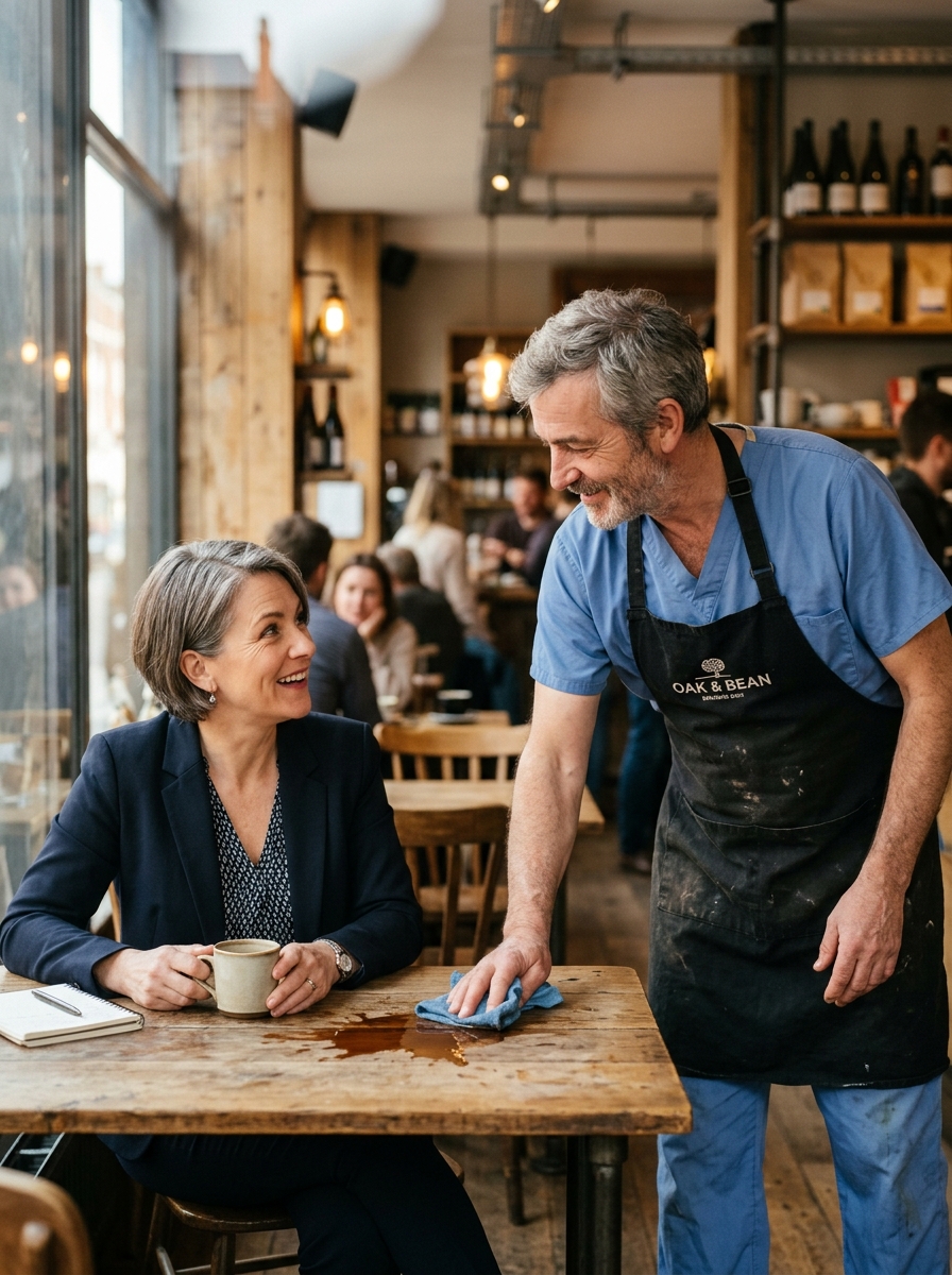 He cleaned up the spill, grabbed napkins, and told the cashier, “Another coffee for her.”