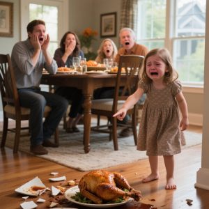 During Thanksgiving dinner, my five-year-old daughter suddenly shouted, ran to the table, and tossed the whole turkey onto the floor. Everyone went silent. I crouched down and asked as gently as I could, “Sweetheart, why did you do that?” She caught her breath, raising her hands triumphantly. “Because I saved all of you!” No one knew what she meant… not until she whispered something that froze the entire room…