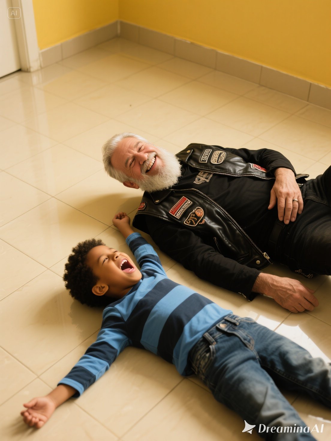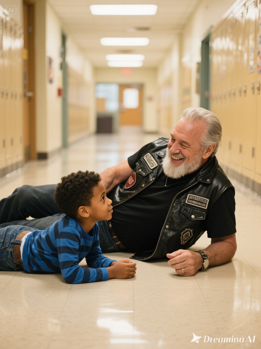 Slowly, Marcus crawled a little closer. Then closer again. Finally, he laid his head on the floor, facing the biker, matching his position exactly.