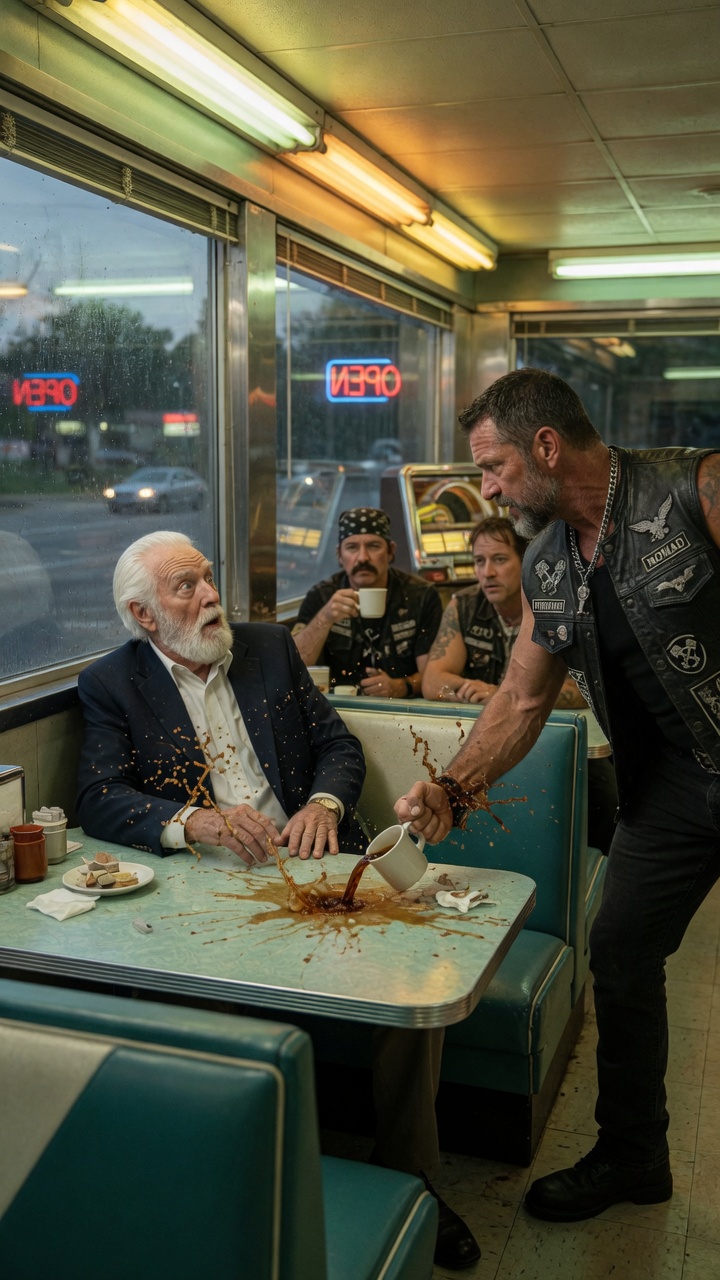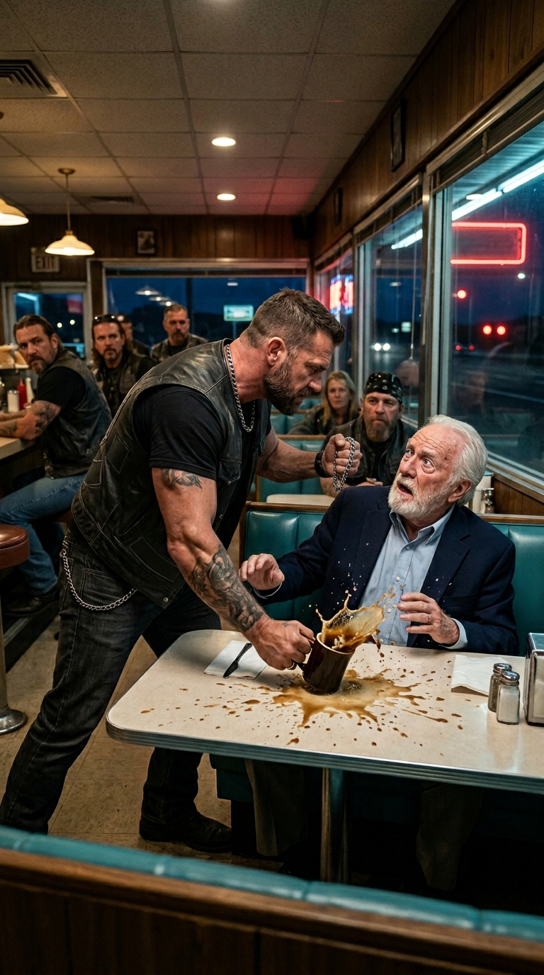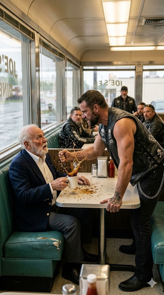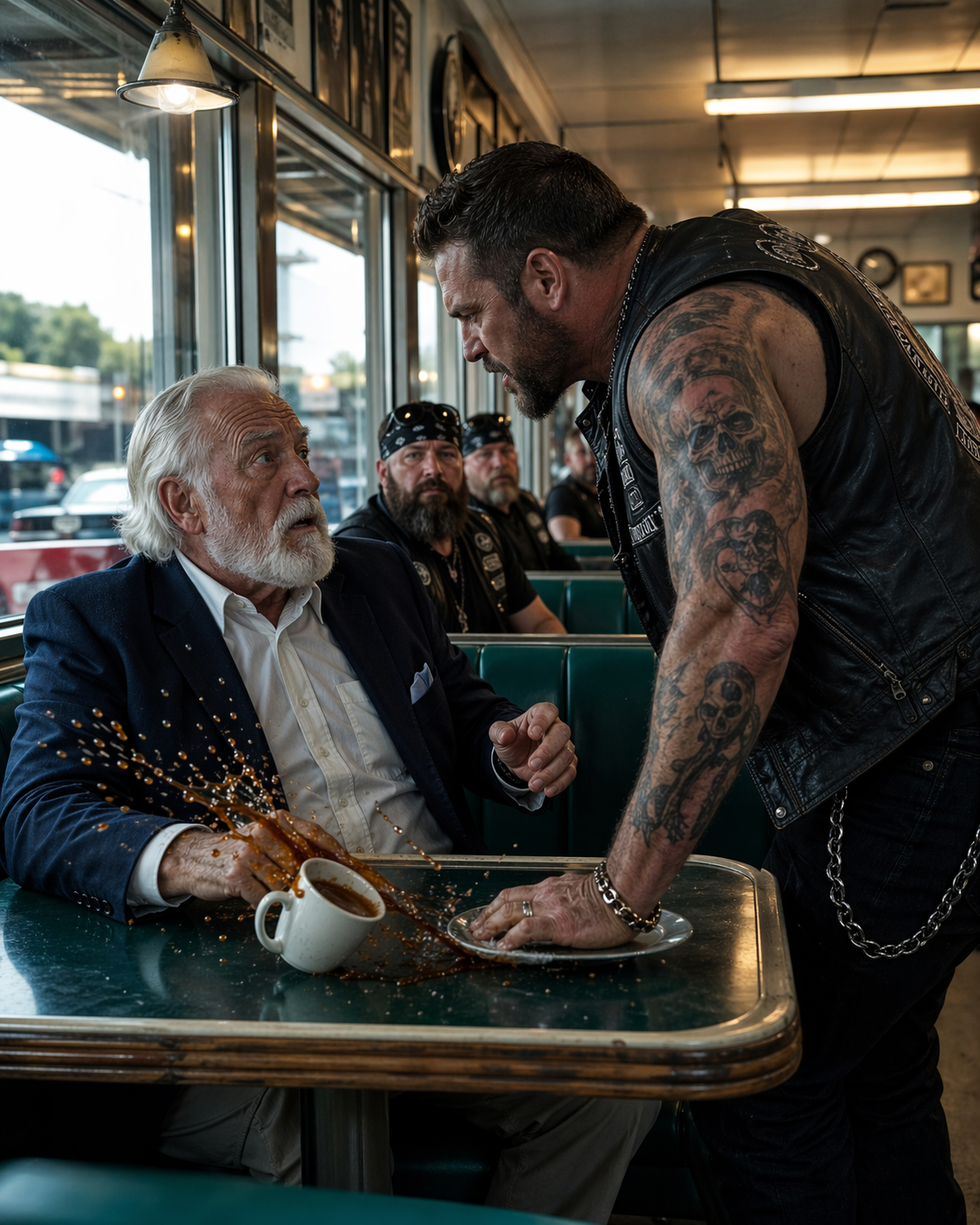 There were six of them, loud enough to turn the whole diner into their stage. Leather vests, heavy boots, big laughs, bigger egos. Their leader, a giant man named Rex, spotted the old man before he even sat down.