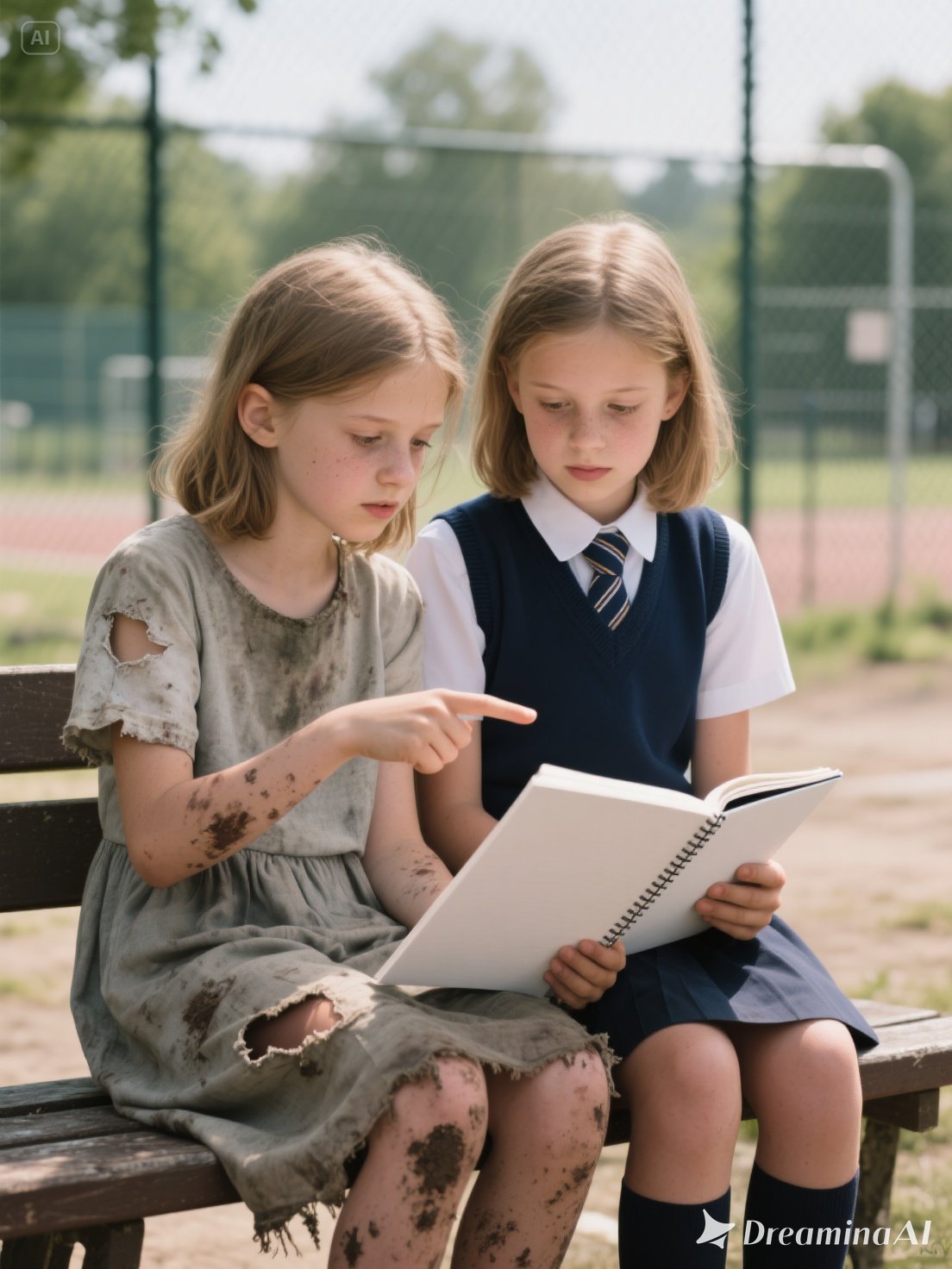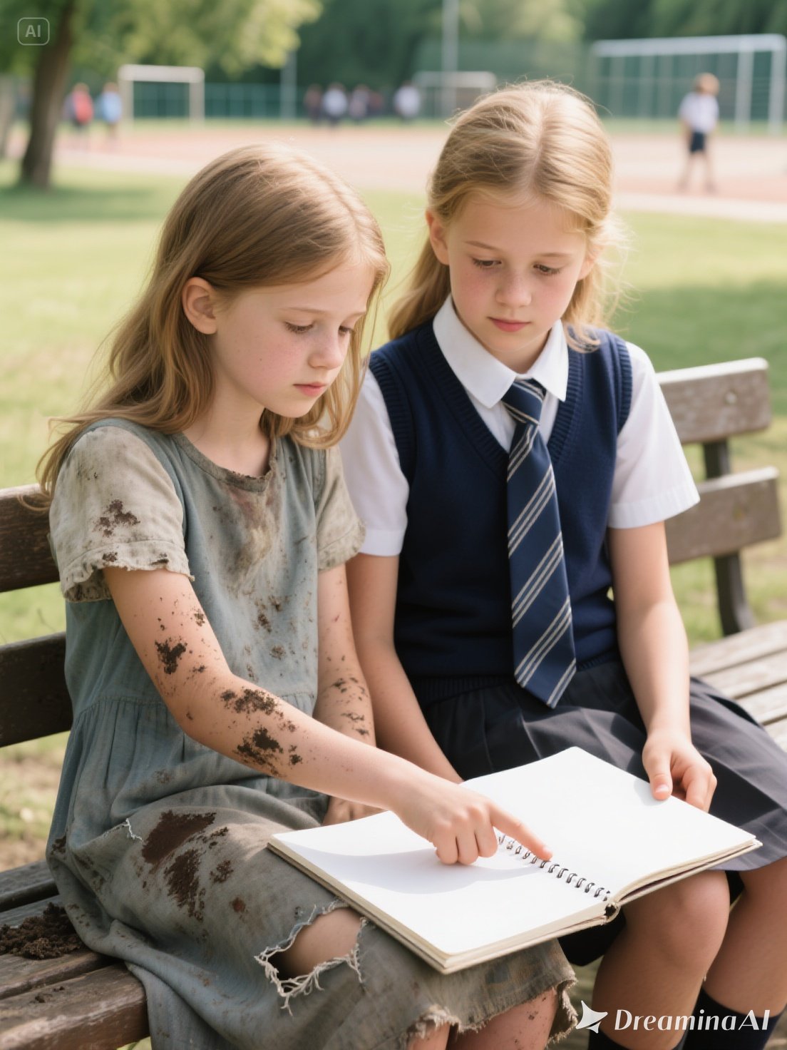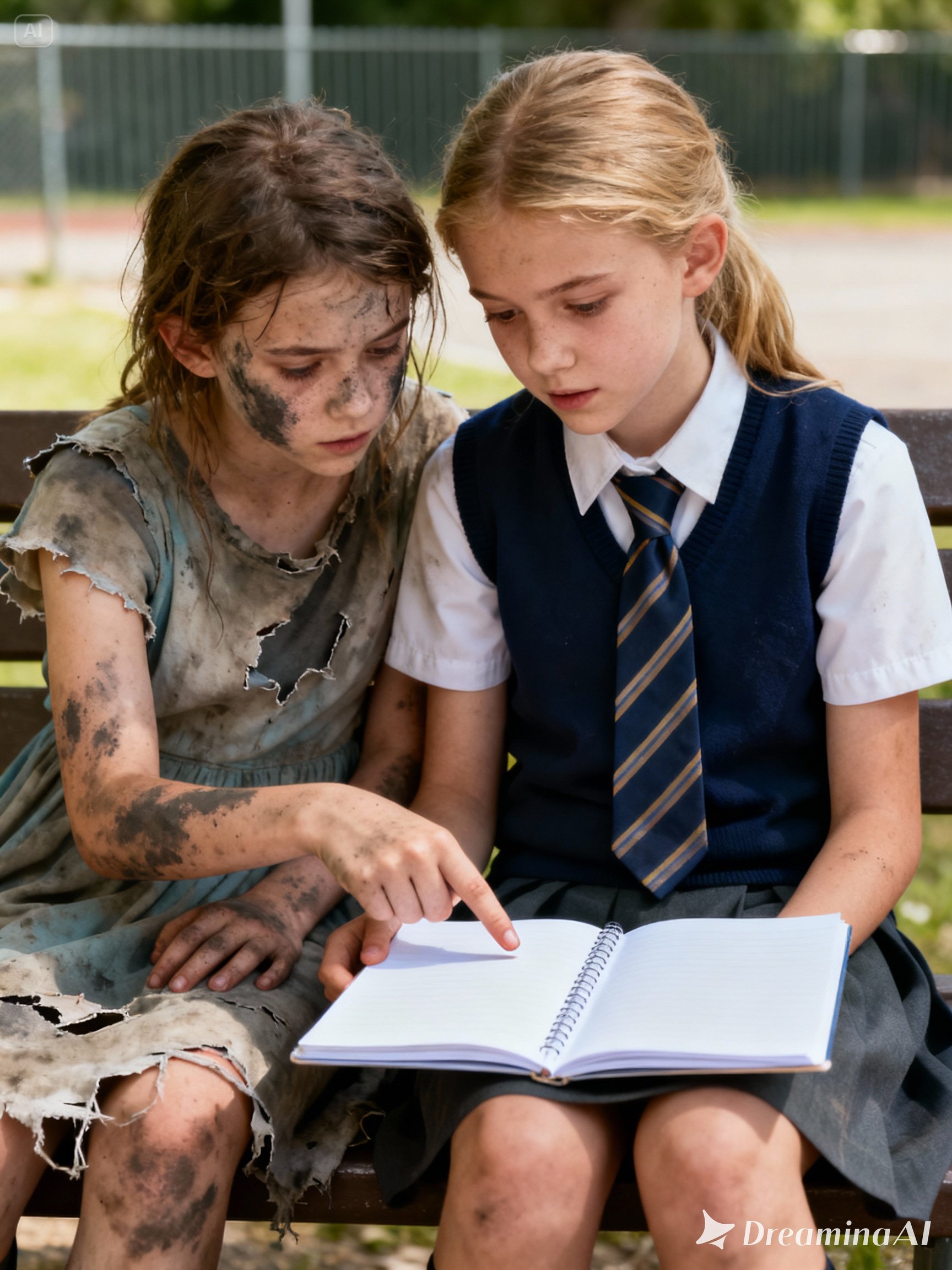 The sound of a sob broke the enchantment. Emily turned toward the noise. On a wooden bench, partially hidden by a bush, a girl her age sat. She wore the school uniform—white shirt, navy blue skirt, and blonde hair in two perfect braids. She held an open notebook and looked frustrated. Emily hesitated. Should she hide? Run back to her side of the fence? But something in the girl’s expression made her approach.