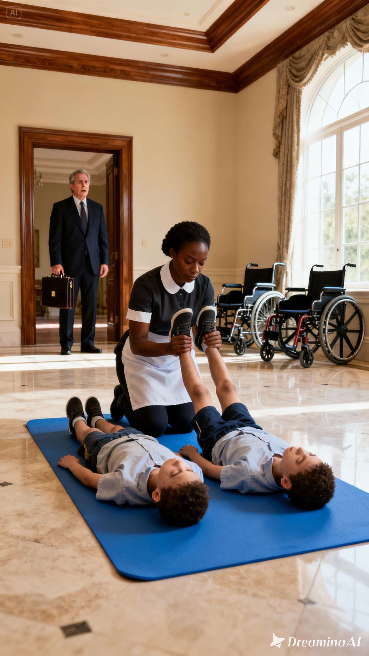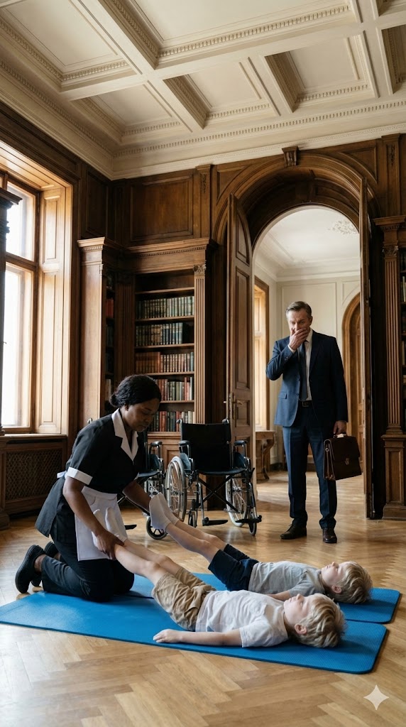 Evan Roth halted at the threshold of the therapy room, his body reacting before his mind could even catch up. His briefcase fell from his hand, clattering softly against the wall, the sound barely reaching his consciousness. The wheelchairs, which normally stood as silent guards by the window, were pushed aside, as though they had no place there anymore. His twin sons sat cross-legged on the soft floor, their frail legs stretched out in front of them, while Rachel Monroe knelt beside them, her hands resting gently on their calves as she spoke to them in a voice so soothing it seemed almost otherworldly.