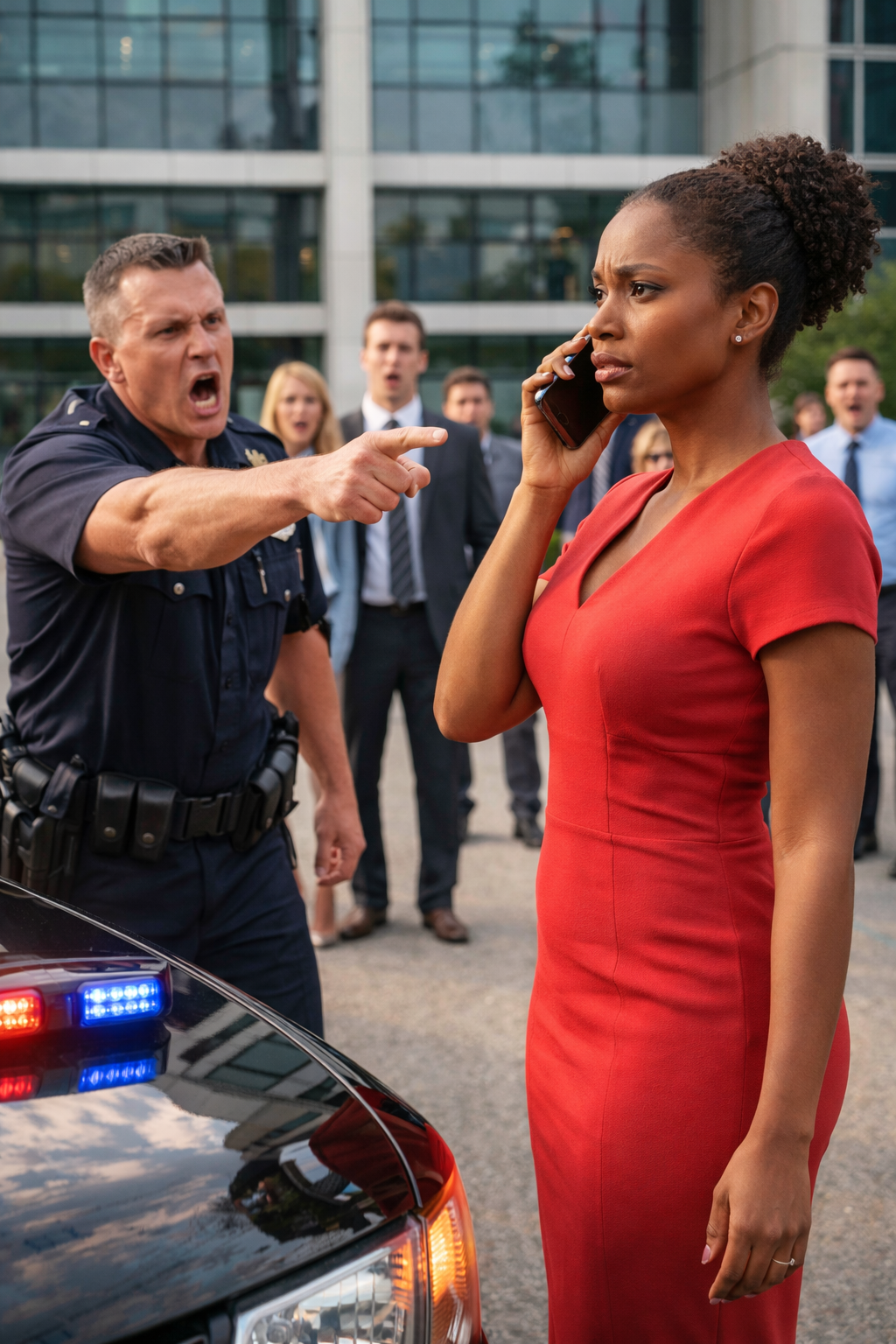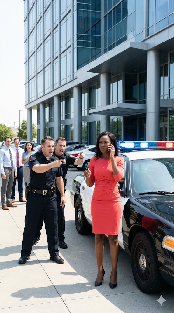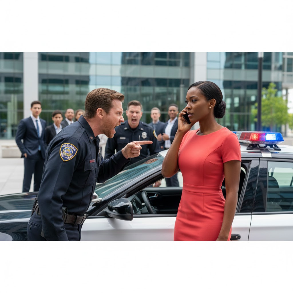 “Step out of the car, ma’am, unless you want to be detained right here.” The words split through the morning air like a starting gun, drawing every gaze toward the glass-fronted building ahead. Moments earlier, the patrol car had swerved across her lane, red and blue lights flashing against the very office she was headed toward.
