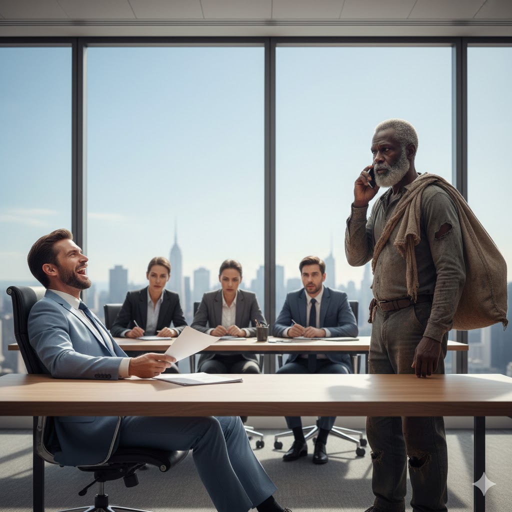 The man stepping out was of that untraceable age sorrow leaves behind—he might have been sixty-five… or seventy-five. His brown jacket was torn at the sleeve; his shirt frayed at the collar; his trousers ripped at one knee. A faded canvas bag hung from his shoulder.