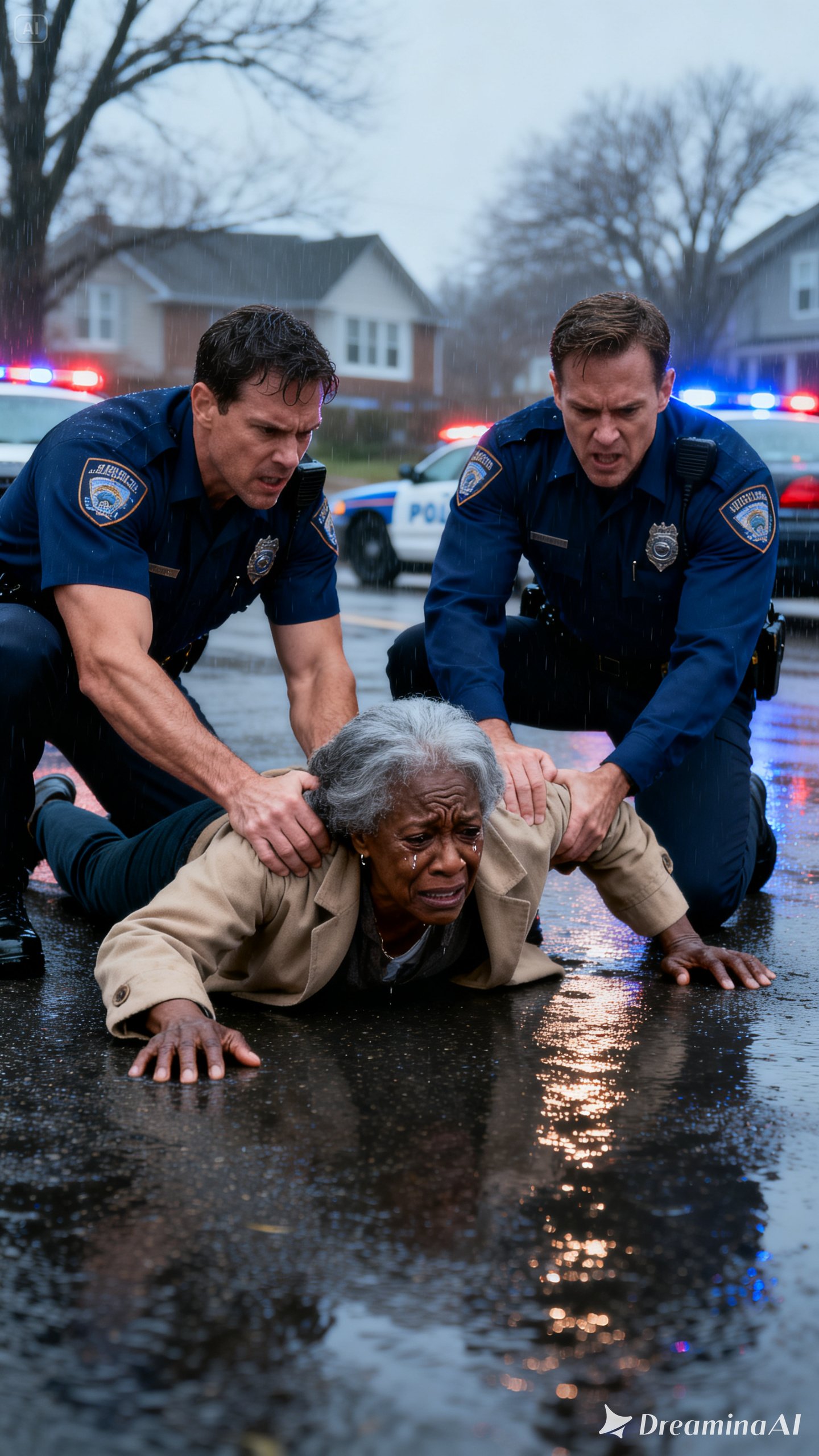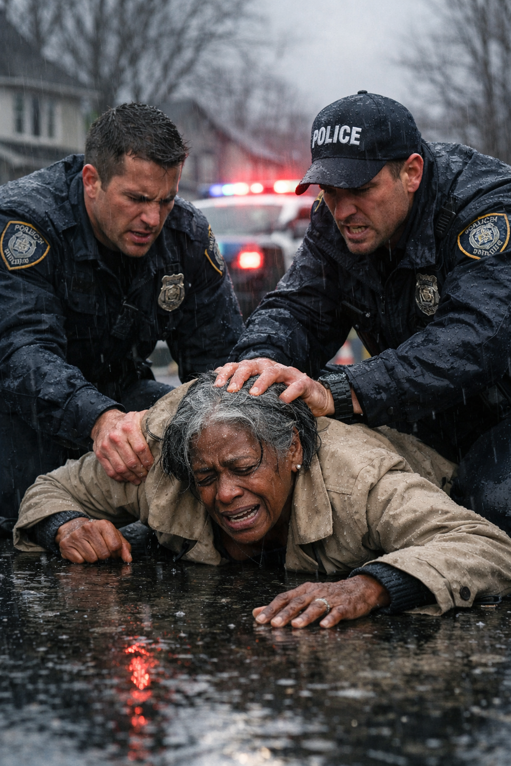 Her hands trembled as she opened the door and stepped into the rain. Her knees ached, her shoulders slumped, but she kept her palms visible.
