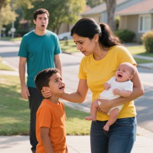 A humble mother helps a crying little boy while holding her son, unaware that his millionaire father is watching.