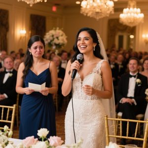 The Place Card That Spoke Louder Than Words Hannah Mitchell stood frozen in the grand ballroom of the Riverside Grand Hotel, staring at the cream-colored place card in...