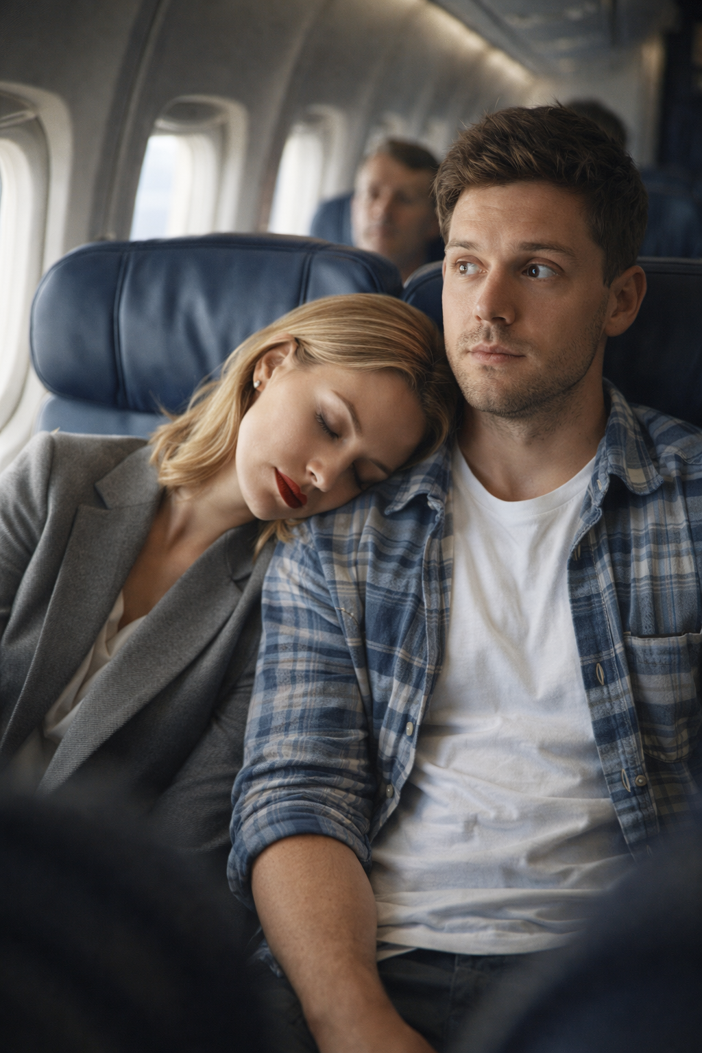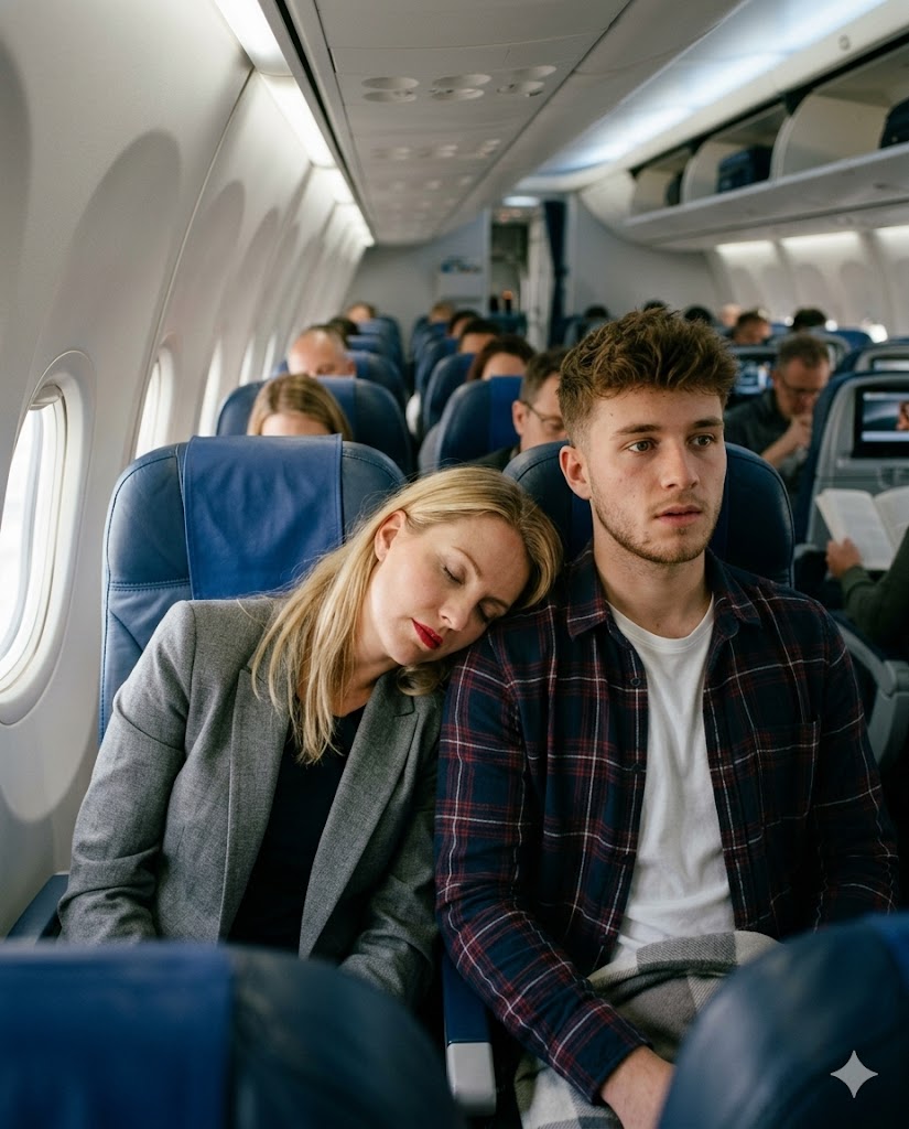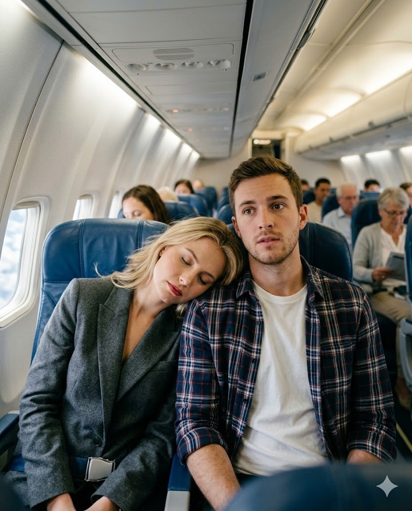 About an hour into the flight, the cabin lights dimmed. Evelyn felt her eyelids grow heavier by the minute. The steady hum of the engines was almost soothing. Before she realized it, she had dozed off—her head leaning against Daniel’s shoulder.