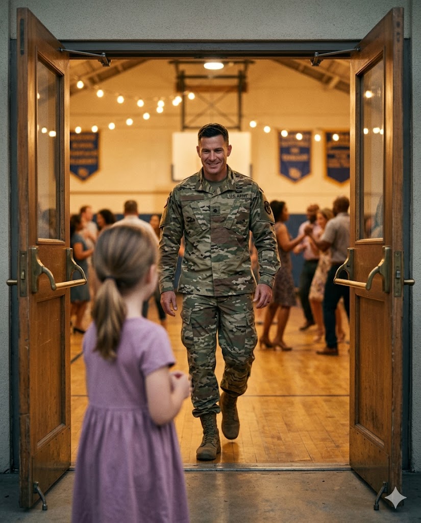 The music started again, but now the entire gym had shifted its attention. Every eye was on the center of the hall. Her father took her hand, and they began to dance. Behind them, his fellow soldiers formed a gentle, protective circle, each standing with respect and warmth, silently honoring the moment.