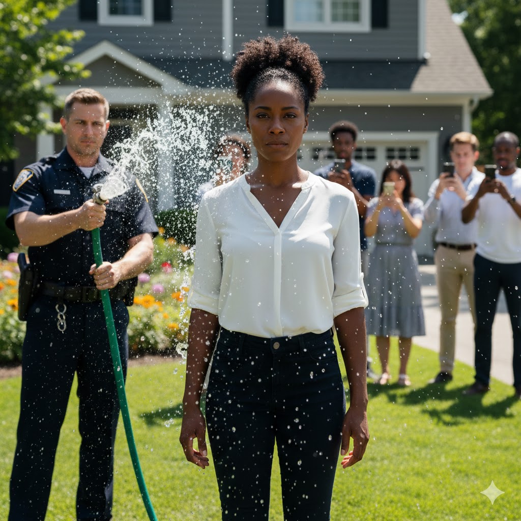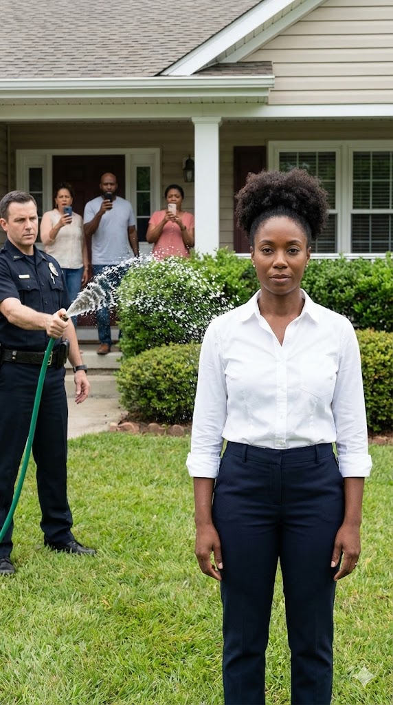 The hose erupts. Full pressure. The blast slams into her face, her chest. She’s knocked backward, crashing onto the grass.