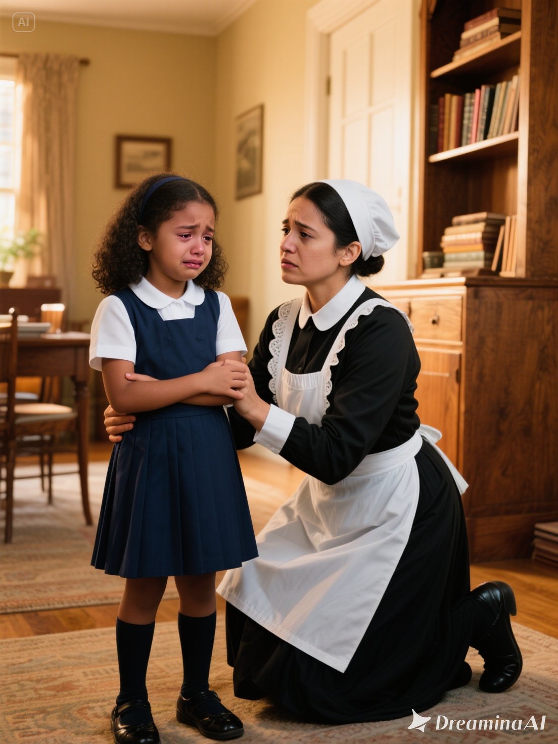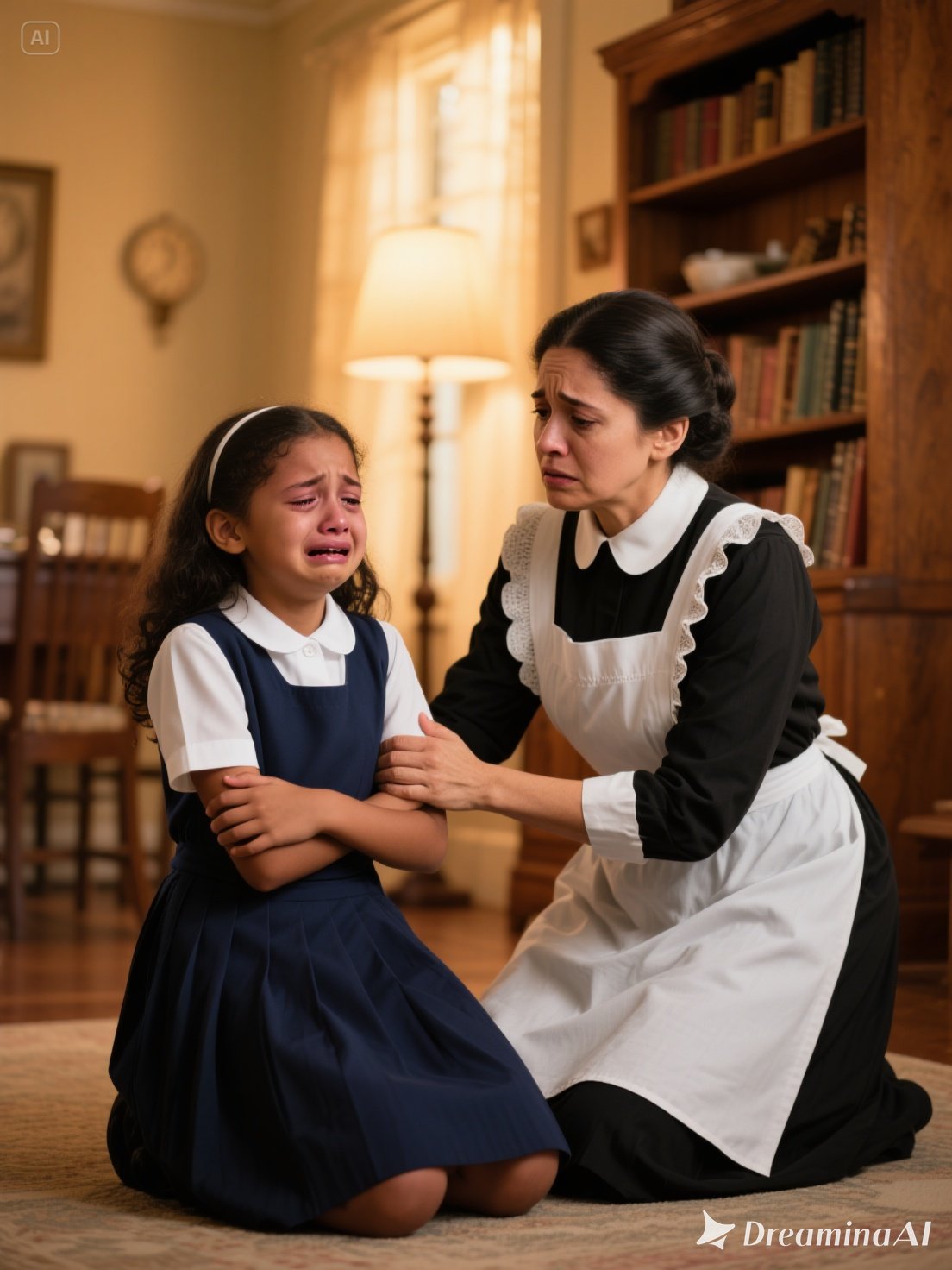 The library was wrapped in a suffocating silence. Portraits of ancestors lined the walls, their eyes seeming to follow every move. In the middle of the room, the maid — dressed in her neat black-and-white uniform — knelt beside the little girl.