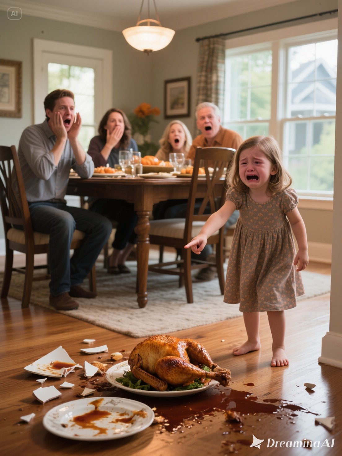 The moment the turkey hit the hardwood floor, the Weston family froze. Knives hovered mid-air, conversations stopped, and even the TV playing the Thanksgiving parade seemed to pause. My five-year-old daughter, Lily, stood in the center of the dining room like a tiny superhero who had just vanquished a villain—chest puffed out, curls bouncing, face flushed with adrenaline.