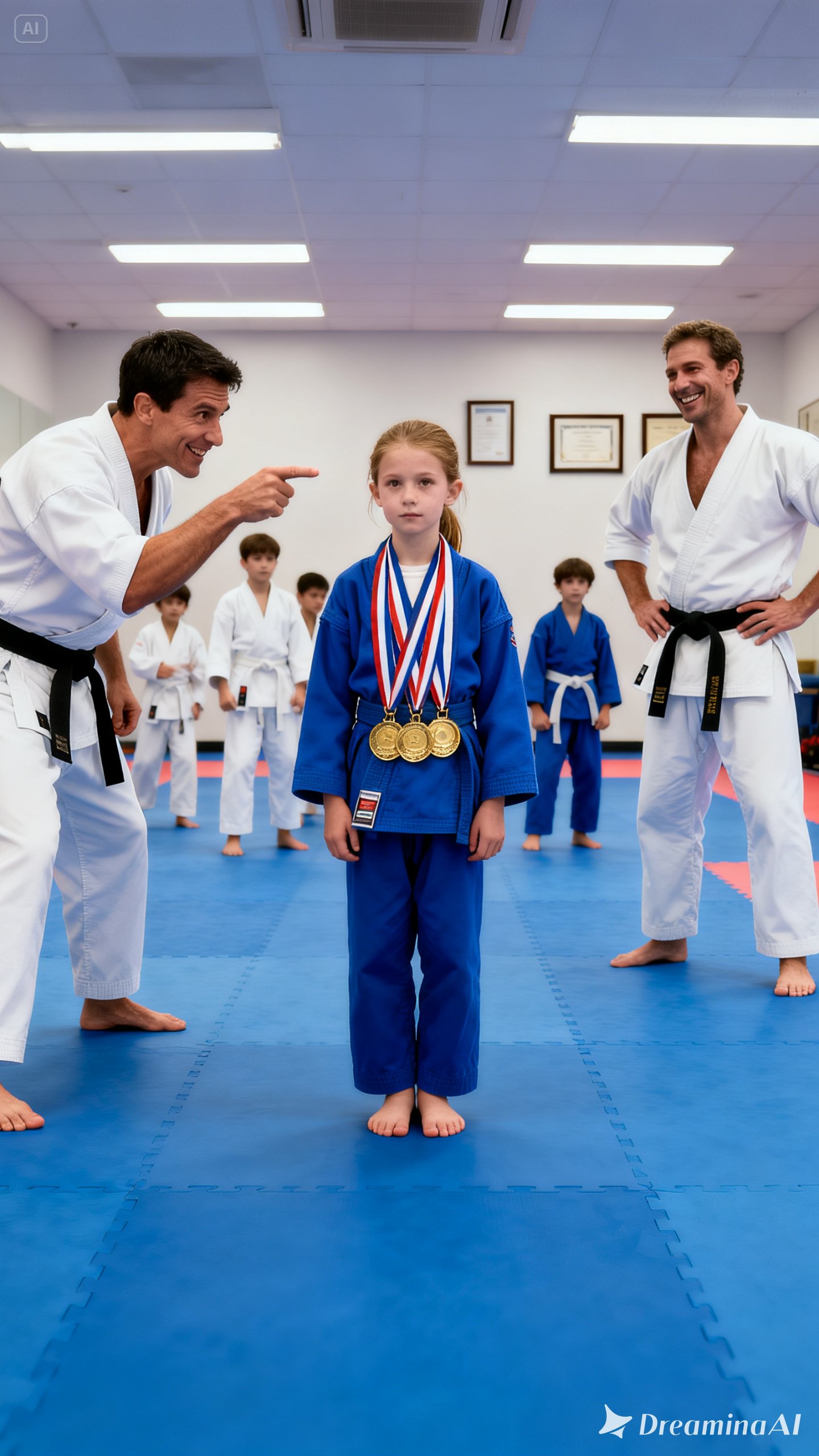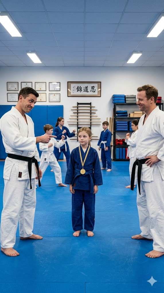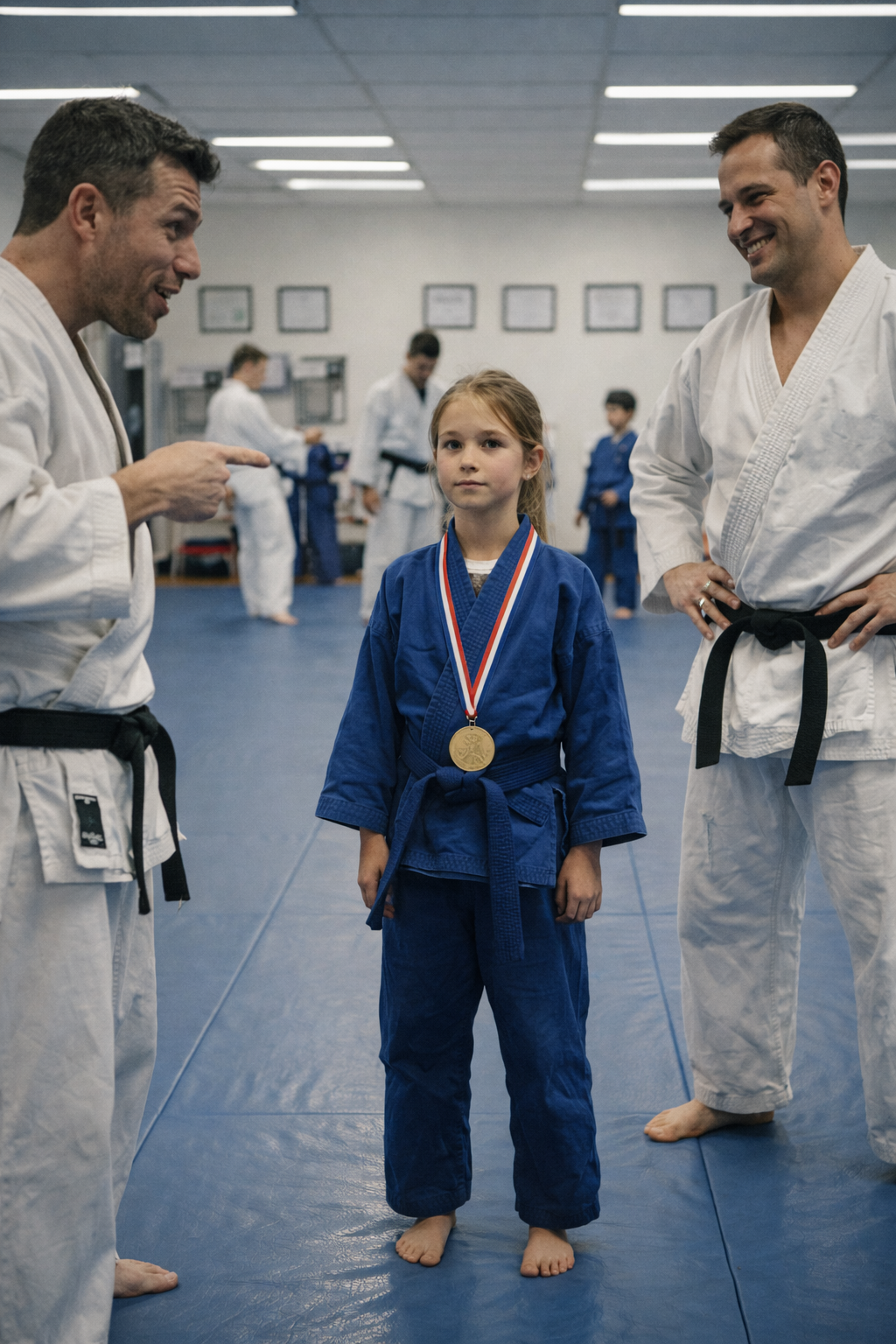 At the far end of the room, Isla Morton, eleven years old, stood in the white folds of a fresh gi. Her belt hung loose at her waist—not carelessly, but without the flourish most instructors liked. Blonde hair tied into a low braid, eyes down, feet bare and planted. She didn’t fidget. That stillness drew their attention.