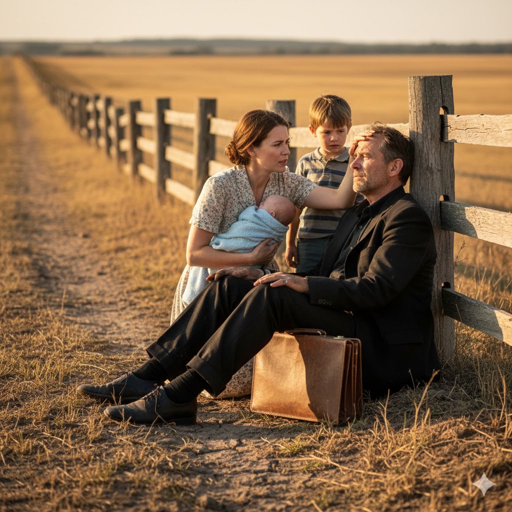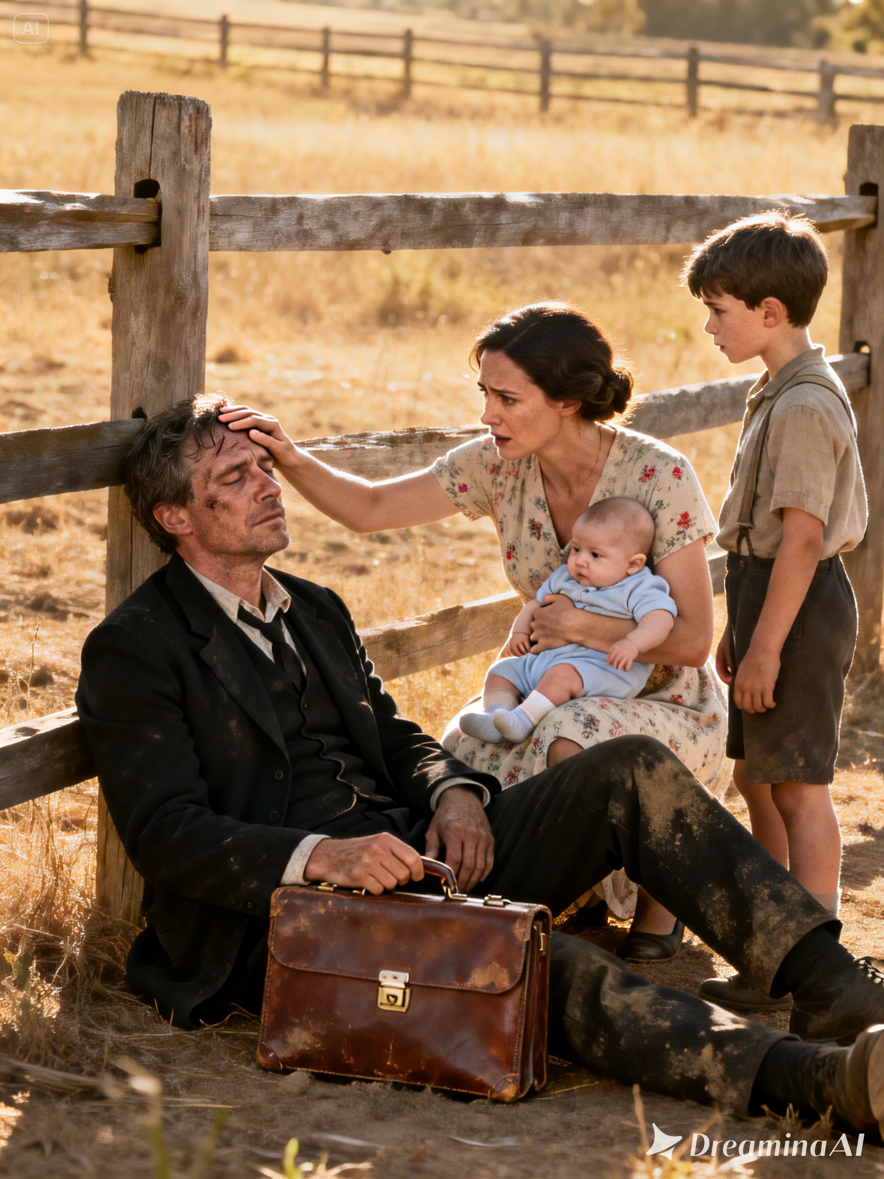 He stumbled once more and collapsed beside a small wooden fence near a modest farmhouse, surrounded by tall trees and endless fields.