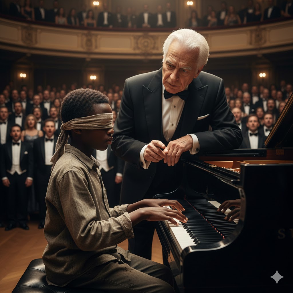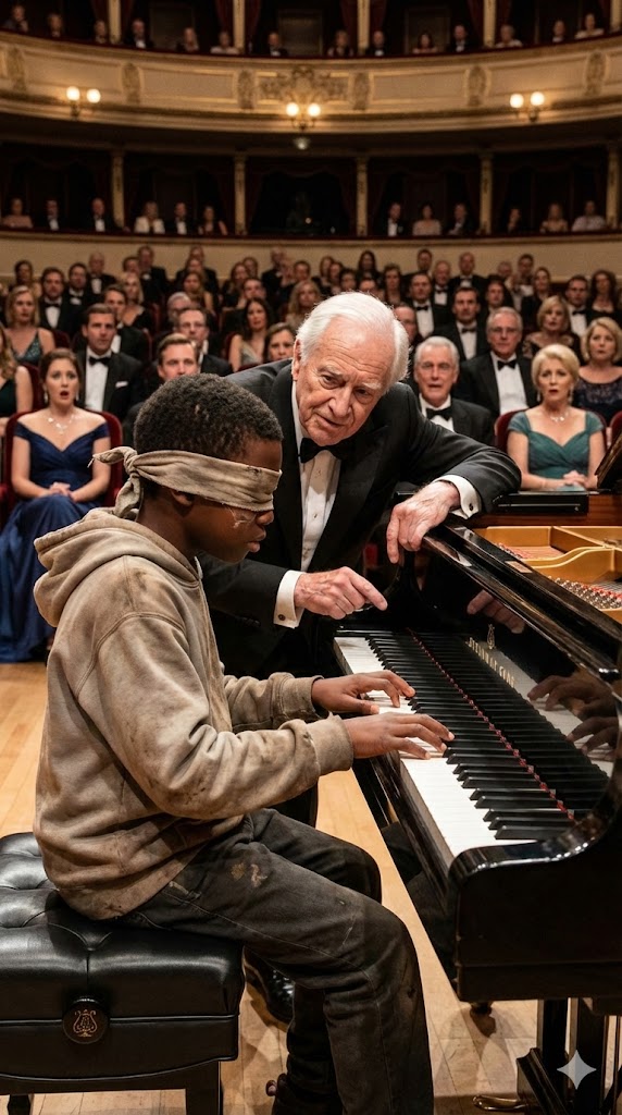 Voss glanced at the boy—dark glasses, white cane. Skepticism flickered across his face—perhaps pity, perhaps doubt. The audience murmured. “Sure, why not?” Voss said with a condescending smile. “Come on up, young man. Play something just for fun. No pressure.”