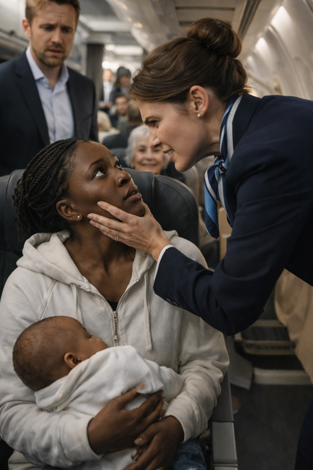 Her composure was almost unsettling, as if she knew something the rest of the cabin didn’t. Baby Zoe had finally quieted, seemingly responding to her mother’s steady heartbeat. The infant’s dark eyes scanned the cabin with innocent curiosity that should have charmed the passengers—but instead, it irritated them further.