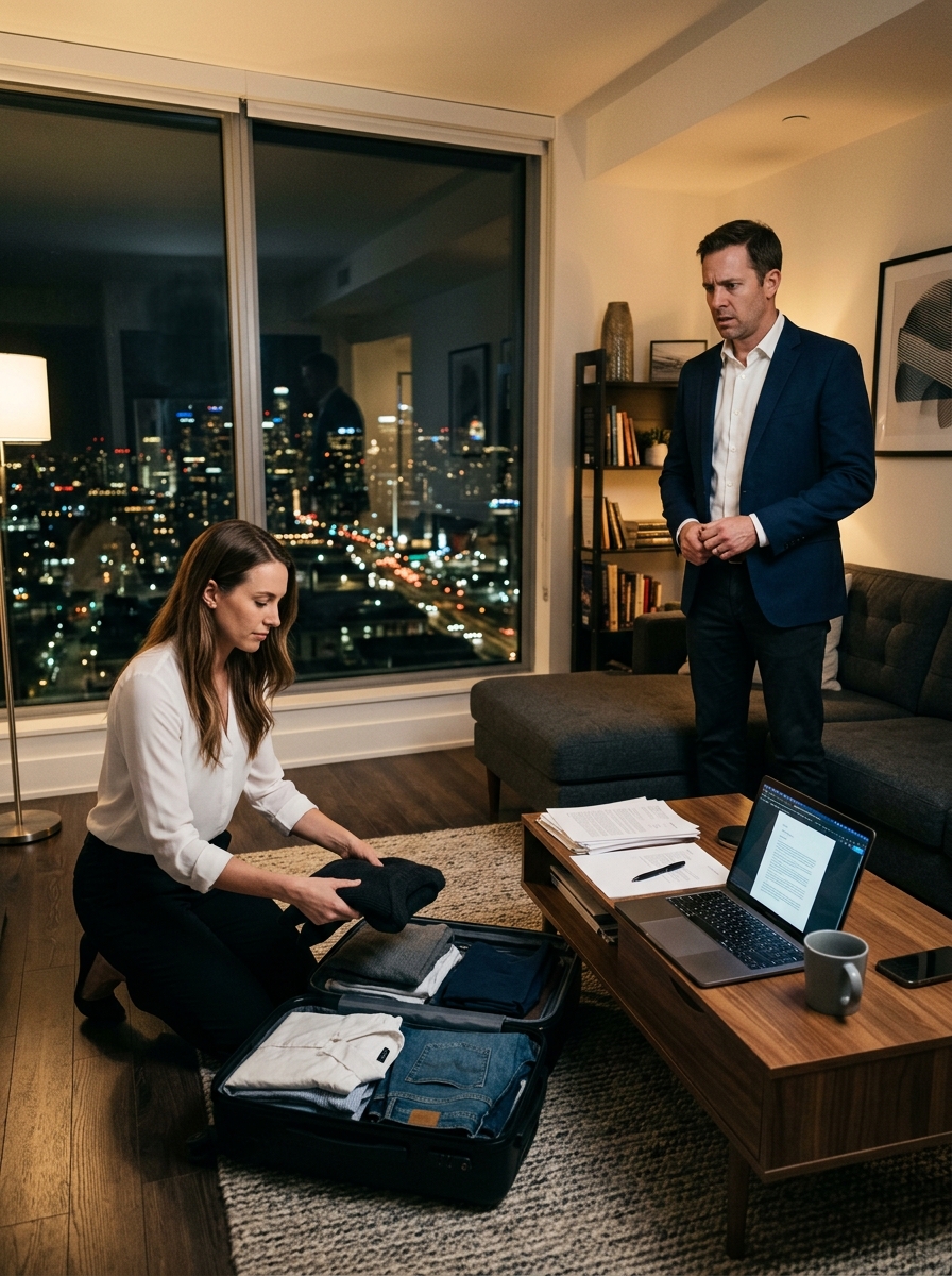 Valeria stood in the middle of the room, calmly folding clothes and placing them into two large dark suitcases. The apartment felt strangely empty. Her books, her paintings, her favorite mugs—gone.