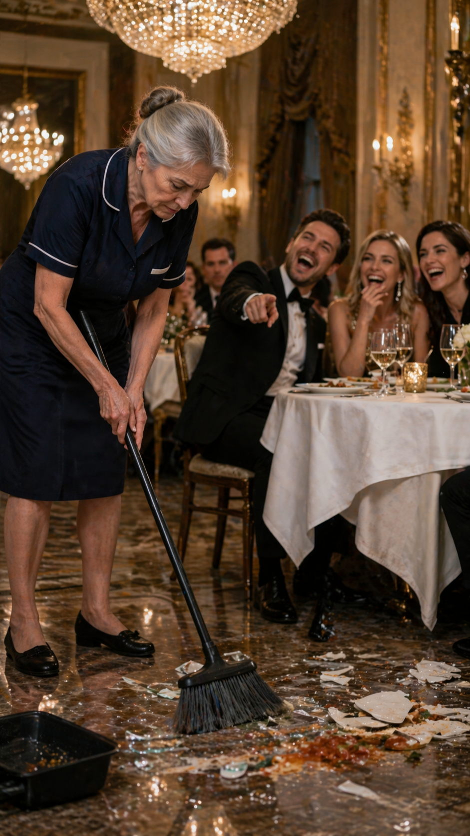 A cleaning lady came hurrying over — a slender woman of around sixty, her hair neatly pinned up. She crouched down without hesitation and began tidying the mess, offering quiet apologies, even though it was plain to everyone watching that she had done nothing to cause it.