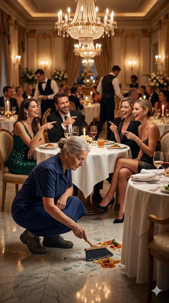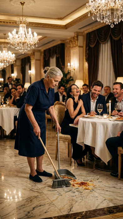 In a Luxurious Restaurant, the Guests at the Next Table Began Mocking the Elderly Cleaning Lady. My Husband Rose from Our Table, Walked Over to Them — and What He Did Next Left the Entire Hall Stunned.