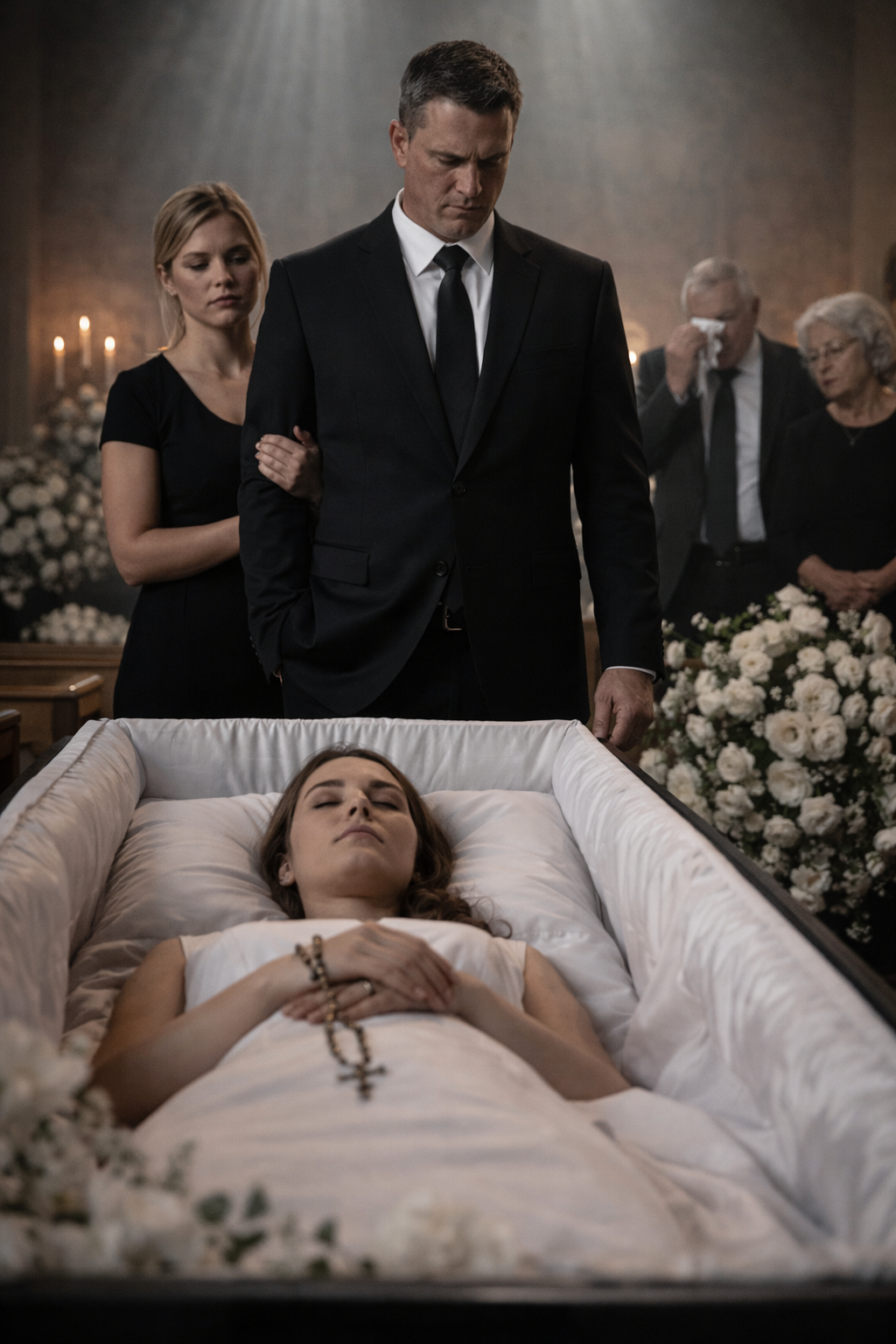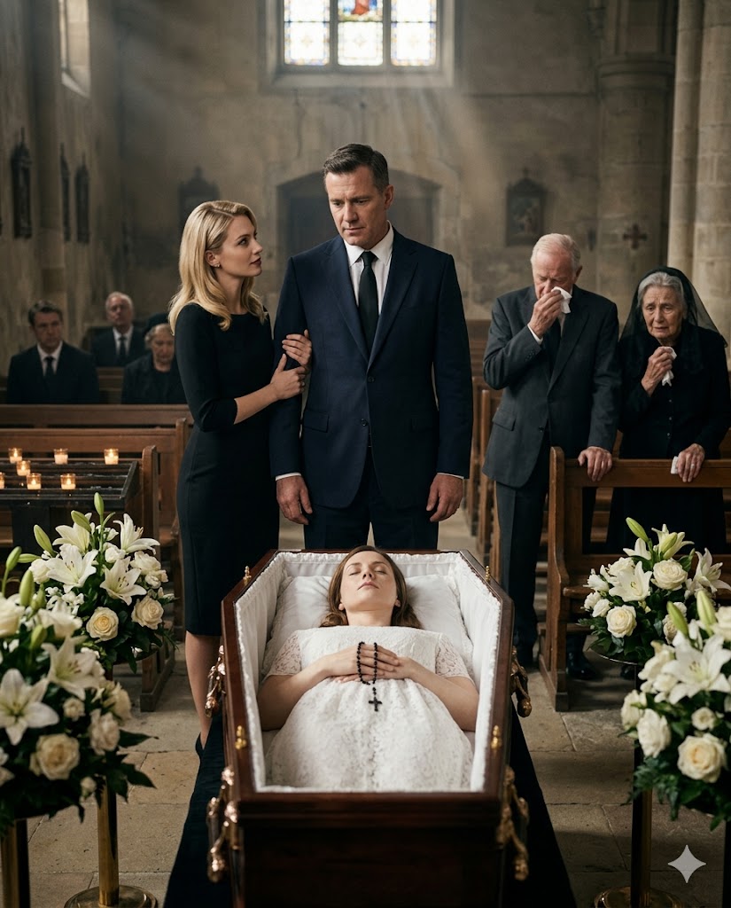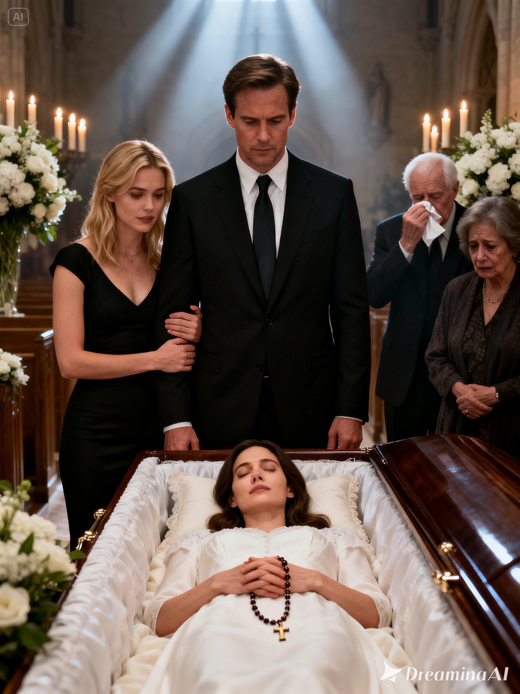He walked straight down the center aisle—past the candles, the flowers, the mourners—and toward the polished casket holding the woman he had spent years betraying.