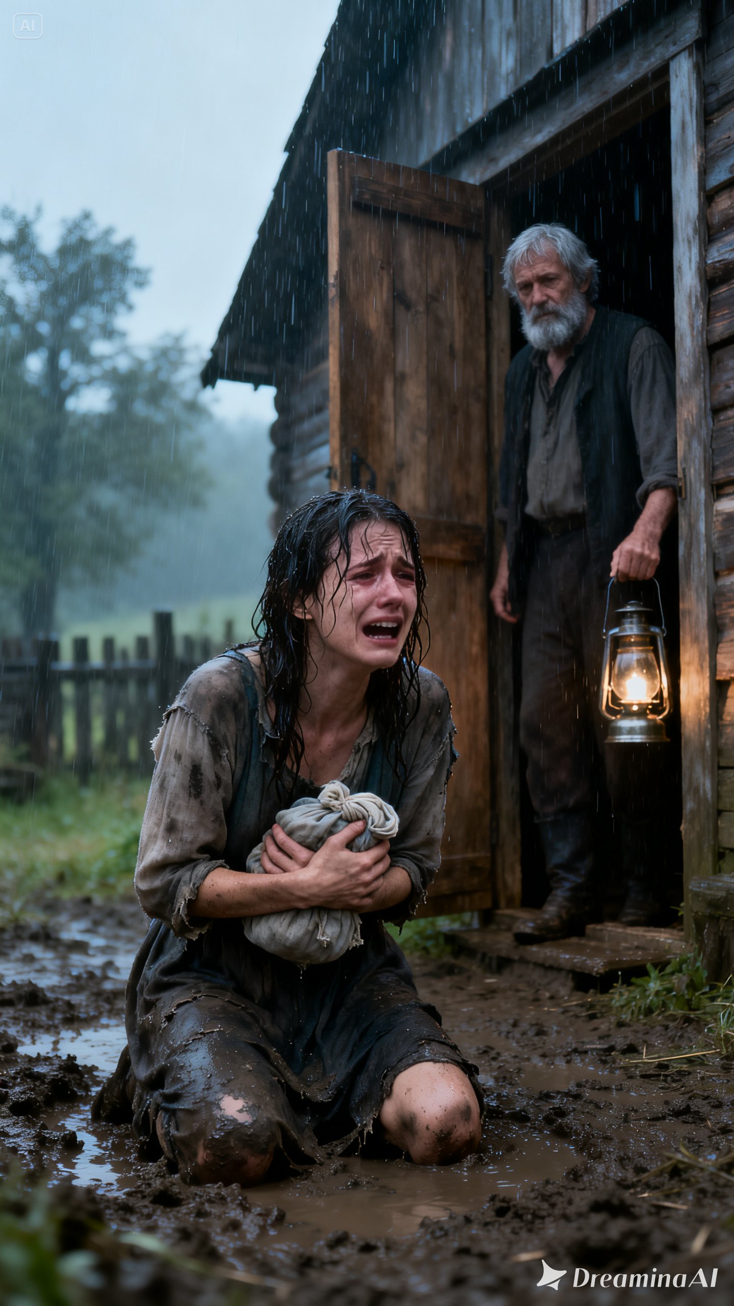 She tried to cry, but exhaustion robbed her even of tears. Forcing herself upright, she began walking along the dirt road, directionless, driven only by instinct. The rain beat down mercilessly, the cold sank into her bones, until her body finally failed her. She collapsed face down by the roadside, clutching the shawl beneath her as if it were her last heartbeat.