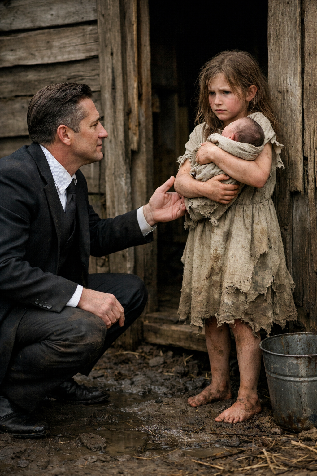 The girl couldn’t have been more than six. Her hair was matted, her face smeared with dirt and soot, her eyes far too old for such a tiny frame. In her arms, she cradled a newborn wrapped in a ripped, filthy cloth, holding him close like the last solid thing left in her world.