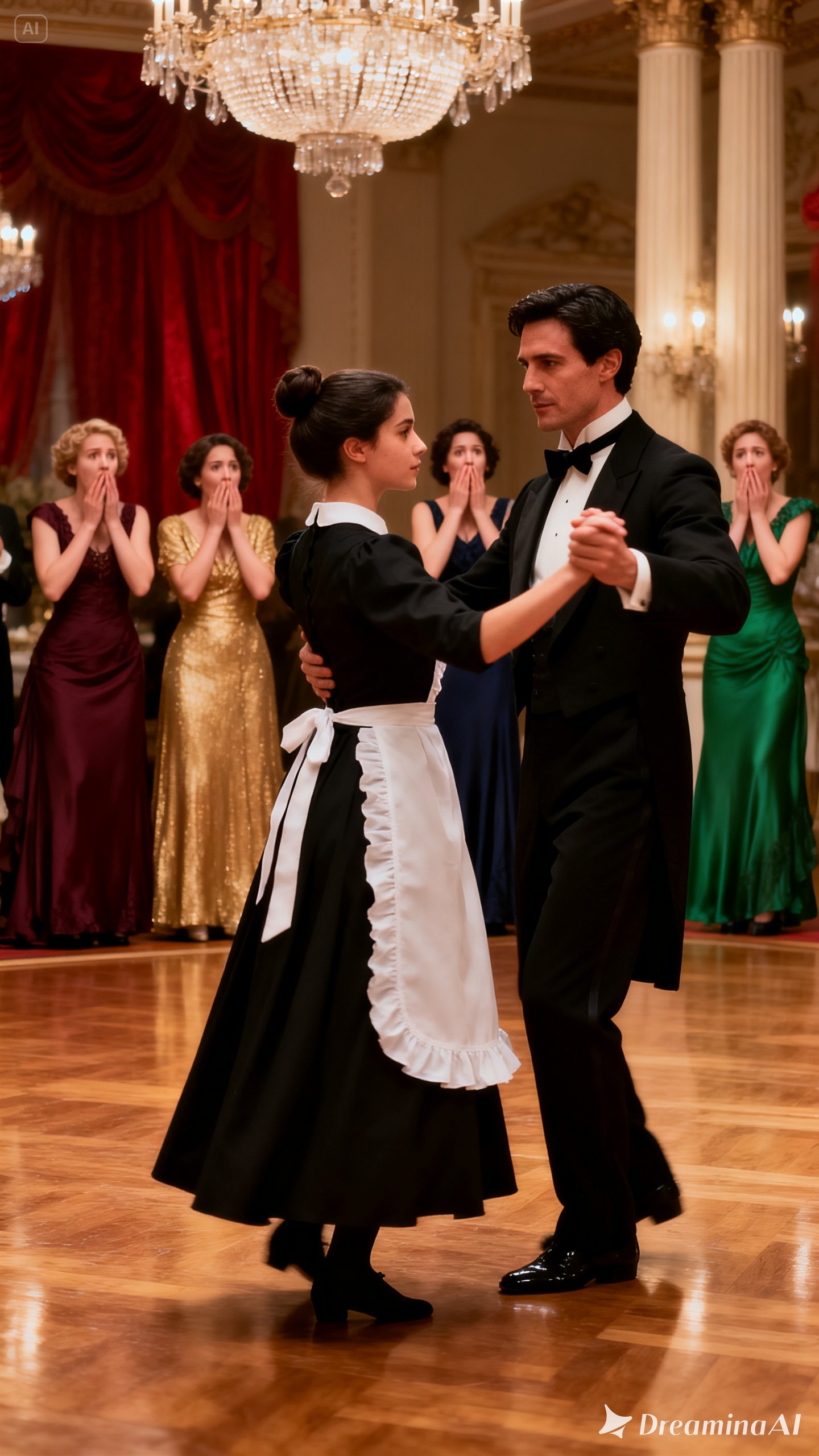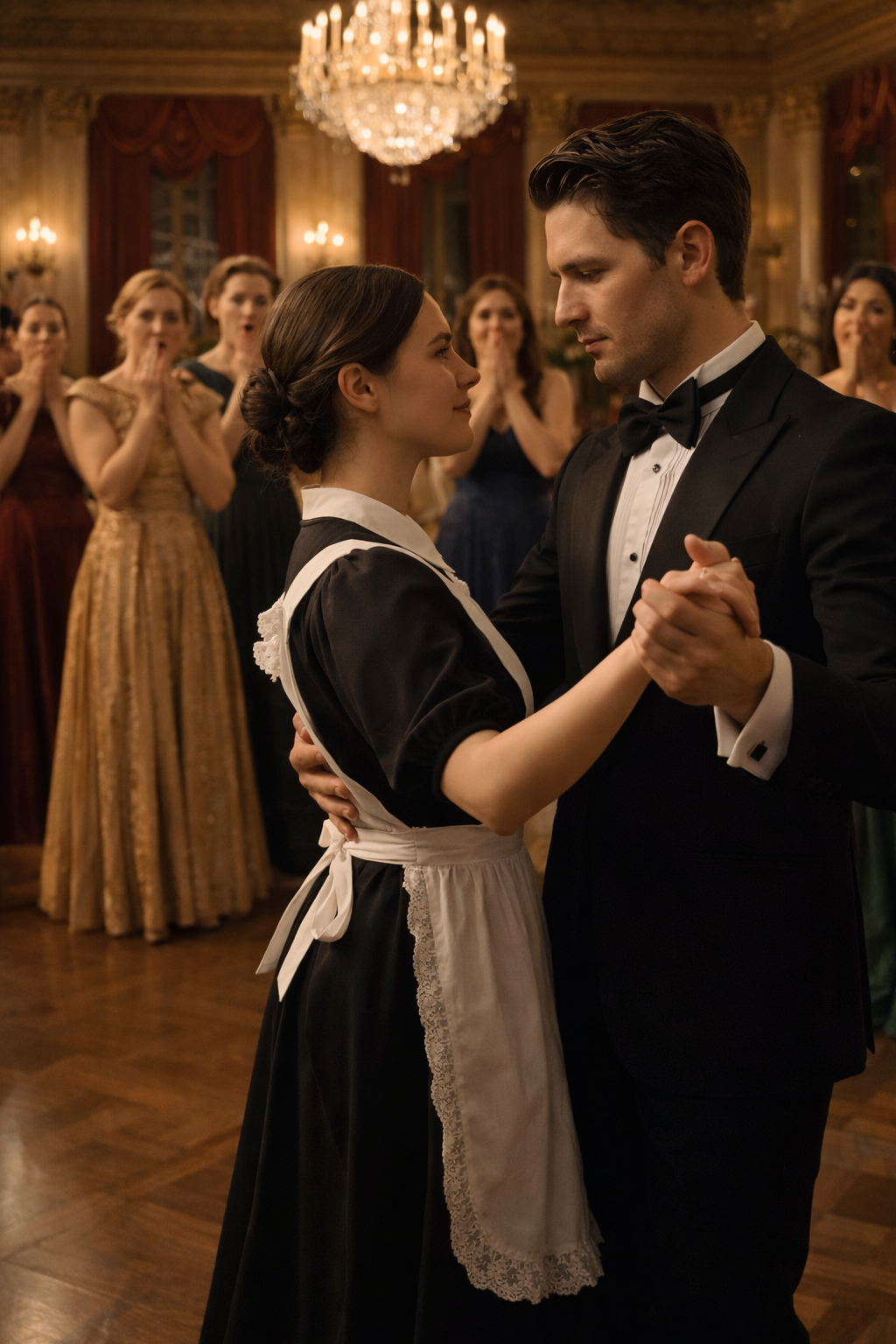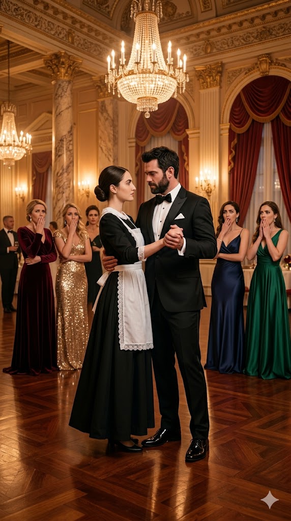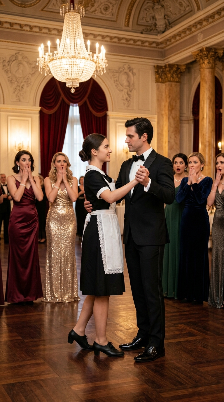 But beneath the grand chandelier, none of it mattered. Diego placed his hand on Sofia’s waist. The contact was electric. Even through the fabric of her uniform, he felt the warmth of her skin, the reality of her body. The orchestra hesitated for a heartbeat, then launched into the first bars of the waltz.