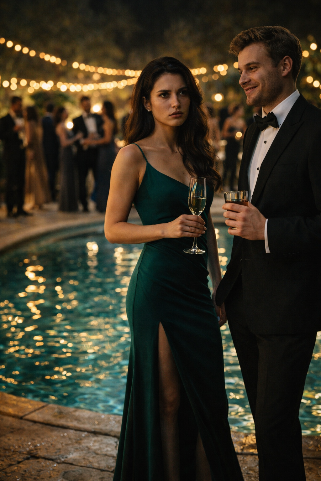 For a heartbeat, she didn’t answer. Instead, her gaze drifted past him, toward the illuminated pool behind him. The water glowed an otherworldly blue, its surface disturbed only by the faint vibrations of the music. Light fractured across it in shimmering patterns, beautiful and treacherous at once.
