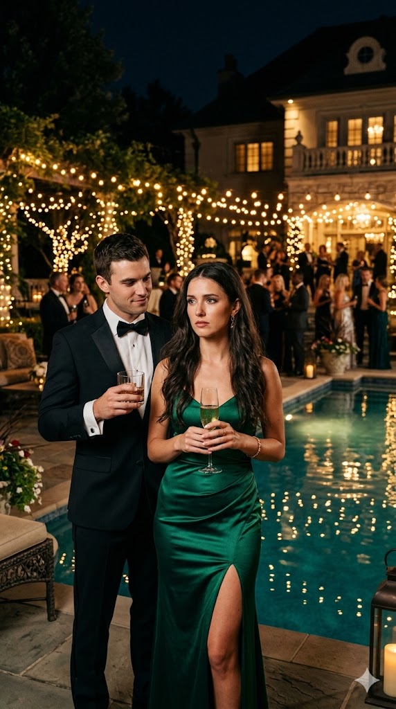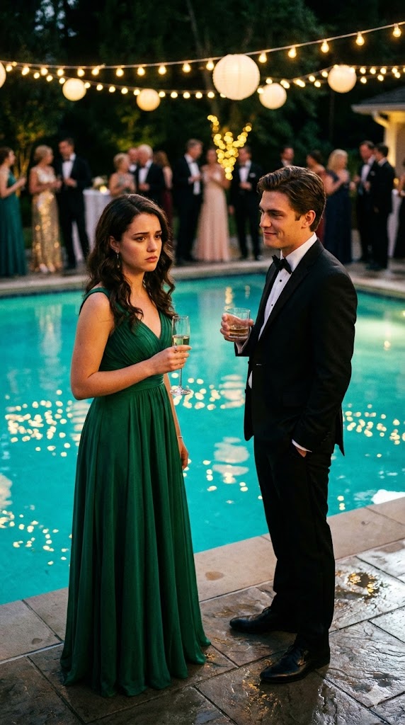 The bass pulsed like a second heartbeat beneath the polished calm of the sophisticated poolside venue, low frequencies rippling across the water so that the surface shimmered in delicate, trembling patterns. Blue ambient lights washed over everything—over the marble tiles that looked almost liquid in their perfection, over the tall glass pillars holding floating candles, over the crystal goblets that chimed softly whenever someone shifted their grip. Waiters in immaculate black circulated with trays of champagne flutes and jewel-colored cocktails, while clusters of impeccably dressed guests leaned close to one another, speaking in hushed, curated tones. It was the sort of exclusive gathering where reputations mattered more than names, where every smile was measured, every laugh rehearsed, and every guest behaved as though nothing inconvenient—or unsightly—could ever intrude on such carefully constructed elegance.